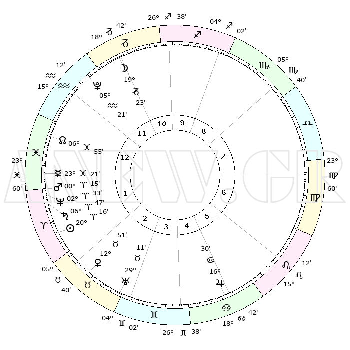 | | ΘΕΣΕΙΣ ΠΛΑΝΗΤΩΝ ΑΣΤΡΟΛΟΓΙΚΟΥ ΧΑΡΤΗ ΤΗΣ ΣΤΙΓΜΗΣ ΑΥΤΗΣ | | | | Πλανήτης | Ζώδιο | Μοίρες | Δεκαήμ. | Σε οίκο | Απόκλιση | | Ακμές των οίκων | | Ηλιος | Κριός | 20°11' | Τρίτο | 2 | 07 N 53 | | 1ος | 10°42' | Υδροχόος | | Σελήνη | Αιγόκερως | 18°24' | Δεύτερο | 12 | 26 S 05 | | 2ος | 26°08' | Ιχθείς | | Ερμής | Ιχθείς | 23°15' | Τρίτο | 1 | 04 S 50 | | 3ος | 02°41' | Ταύρος | | Αφροδίτη | Ταύρος | 12°45' | Δεύτερο | 3 | 15 N 37 | | 4ος | 29°27' | Ταύρος | | Αρης | Κριός | 00°11'R | Πρώτο | 2 | 00 S 51 | | 5ος | 21°35' | Δίδυμοι | | Δίας | Καρκίνος | 16°29' | Δεύτερο | 6 | 22 N 47 | | 6ος | 13°32' | Καρκίνος | | Κρόνος | Κριός | 06°47' | Πρώτο | 2 | 00 N 44 | | 7ος | 10°42' | Λέων | | Ουρανός | Ταύρος | 29°11' | Τρίτο | 3 | 19 N 48 | | 8ος | 26°08' | Παρθένος | | Ποσειδώνας | Κριός | 02°33' | Πρώτο | 2 | 00 S 11 | | 9ος | 02°41' | Σκορπιός | | Πλούτωνας | Υδροχόος | 05°21' | Πρώτο | 12 | 22 S 47 | | 10ος | 29°27' | Σκορπιός | | Β. Δεσμός | Ιχθείς | 06°56' | Πρώτο | 1 | 08 S 58 | | 11ος | 21°35' | Τοξότης | | Ωροσκόπος | Υδροχόος | 10°42' | Δεύτερο | | | 12ος | 13°32' | Αιγόκερως | | Μεσουράνημα | Σκορπιός | 29°27' | Τρίτο | | | |