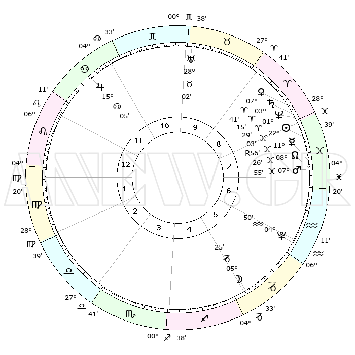 | | ΘΕΣΕΙΣ ΠΛΑΝΗΤΩΝ ΑΣΤΡΟΛΟΓΙΚΟΥ ΧΑΡΤΗ ΤΗΣ ΣΤΙΓΜΗΣ ΑΥΤΗΣ | | | | Πλανήτης | Ζώδιο | Μοίρες | Δεκαήμ. | Σε οίκο | Απόκλιση | | Ακμές των οίκων | | Ηλιος | Ιχθείς | 21°59' | Τρίτο | 8 | 03 S 11 | | 1ος | 16°24' | Λέων | | Σελήνη | Αιγόκερως | 04°41' | Πρώτο | 5 | 28 S 06 | | 2ος | 08°50' | Παρθένος | | Ερμής | Ιχθείς | 11°59'R | Δεύτερο | 8 | 04 S 20 | | 3ος | 06°03' | Ζυγός | | Αφροδίτη | Κριός | 07°36' | Πρώτο | 9 | 02 N 00 | | 4ος | 08°33' | Σκορπιός | | Αρης | Ιχθείς | 07°52' | Πρώτο | 7 | 09 S 38 | | 5ος | 13°43' | Τοξότης | | Δίας | Καρκίνος | 15°05' | Δεύτερο | 11 | 22 N 56 | | 6ος | 17°02' | Αιγόκερως | | Κρόνος | Κριός | 03°15' | Πρώτο | 8 | 00 S 40 | | 7ος | 16°24' | Υδροχόος | | Ουρανός | Ταύρος | 28°02' | Τρίτο | 10 | 19 N 33 | | 8ος | 08°50' | Ιχθείς | | Ποσειδώνας | Κριός | 01°29' | Πρώτο | 8 | 00 S 37 | | 9ος | 06°03' | Κριός | | Πλούτωνας | Υδροχόος | 04°50' | Πρώτο | 6 | 22 S 50 | | 10ος | 08°33' | Ταύρος | | Β. Δεσμός | Ιχθείς | 08°26' | Πρώτο | 7 | 08 S 24 | | 11ος | 13°43' | Δίδυμοι | | Ωροσκόπος | Λέων | 16°24' | Δεύτερο | | | 12ος | 17°02' | Καρκίνος | | Μεσουράνημα | Ταύρος | 08°33' | Πρώτο | | | |
