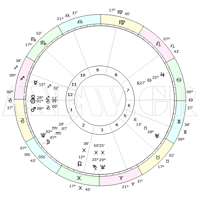 | | ΘΕΣΕΙΣ ΠΛΑΝΗΤΩΝ ΑΣΤΡΟΛΟΓΙΚΟΥ ΧΑΡΤΗ ΤΗΣ ΣΤΙΓΜΗΣ ΑΥΤΗΣ | | | | Πλανήτης | Ζώδιο | Μοίρες | Δεκαήμ. | Σε οίκο | Απόκλιση | | Ακμές των οίκων | | Ηλιος | Αιγόκερως | 01°33' | Πρώτο | 1 | 23 S 25 | | 1ος | 04°50' | Τοξότης | | Σελήνη | Υδροχόος | 06°05' | Πρώτο | 2 | 21 S 34 | | 2ος | 06°40' | Αιγόκερως | | Ερμής | Τοξότης | 15°25' | Δεύτερο | 1 | 22 S 09 | | 3ος | 13°11' | Υδροχόος | | Αφροδίτη | Τοξότης | 28°05' | Τρίτο | 1 | 23 S 35 | | 4ος | 19°17' | Ιχθείς | | Αρης | Αιγόκερως | 05°57' | Πρώτο | 1 | 24 S 08 | | 5ος | 19°40' | Κριός | | Δίας | Καρκίνος | 22°28'R | Τρίτο | 8 | 21 N 46 | | 6ος | 14°05' | Ταύρος | | Κρόνος | Ιχθείς | 25°50' | Τρίτο | 4 | 03 S 45 | | 7ος | 04°50' | Δίδυμοι | | Ουρανός | Ταύρος | 28°13'R | Τρίτο | 6 | 19 N 34 | | 8ος | 06°40' | Καρκίνος | | Ποσειδώνας | Ιχθείς | 29°25' | Τρίτο | 4 | 01 S 28 | | 9ος | 13°11' | Λέων | | Πλούτωνας | Υδροχόος | 02°28' | Πρώτο | 2 | 23 S 16 | | 10ος | 19°17' | Παρθένος | | Β. Δεσμός | Ιχθείς | 12°38' | Δεύτερο | 3 | 06 S 49 | | 11ος | 19°40' | Ζυγός | | Ωροσκόπος | Τοξότης | 04°50' | Πρώτο | | | 12ος | 14°05' | Σκορπιός | | Μεσουράνημα | Παρθένος | 19°17' | Δεύτερο | | | |