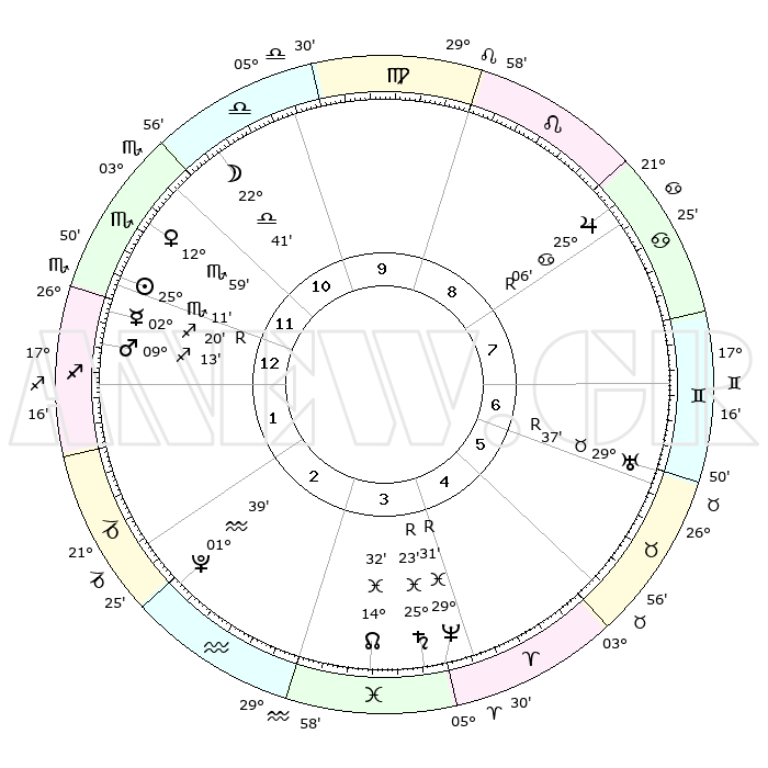 | | ΘΕΣΕΙΣ ΠΛΑΝΗΤΩΝ ΑΣΤΡΟΛΟΓΙΚΟΥ ΧΑΡΤΗ ΤΗΣ ΣΤΙΓΜΗΣ ΑΥΤΗΣ | | | | Πλανήτης | Ζώδιο | Μοίρες | Δεκαήμ. | Σε οίκο | Απόκλιση | | Ακμές των οίκων | | Ηλιος | Σκορπιός | 25°05' | Τρίτο | 1 | 19 S 02 | | 1ος | 17°55' | Σκορπιός | | Σελήνη | Ζυγός | 21°30' | Τρίτο | 11 | 11 S 06 | | 2ος | 17°39' | Τοξότης | | Ερμής | Τοξότης | 02°27'R | Πρώτο | 1 | 21 S 11 | | 3ος | 21°31' | Αιγόκερως | | Αφροδίτη | Σκορπιός | 12°52' | Δεύτερο | 12 | 14 S 36 | | 4ος | 26°60' | Υδροχόος | | Αρης | Τοξότης | 09°09' | Πρώτο | 1 | 22 S 21 | | 5ος | 29°13' | Ιχθείς | | Δίας | Καρκίνος | 25°06'R | Τρίτο | 9 | 21 N 14 | | 6ος | 25°54' | Κριός | | Κρόνος | Ιχθείς | 25°23'R | Τρίτο | 4 | 04 S 03 | | 7ος | 17°55' | Ταύρος | | Ουρανός | Ταύρος | 29°37'R | Τρίτο | 7 | 19 N 52 | | 8ος | 17°39' | Δίδυμοι | | Ποσειδώνας | Ιχθείς | 29°31'R | Τρίτο | 5 | 01 S 26 | | 9ος | 21°31' | Καρκίνος | | Πλούτωνας | Υδροχόος | 01°39' | Πρώτο | 3 | 23 S 28 | | 10ος | 26°60' | Λέων | | Β. Δεσμός | Ιχθείς | 14°33' | Δεύτερο | 4 | 06 S 05 | | 11ος | 29°13' | Παρθένος | | Ωροσκόπος | Σκορπιός | 17°55' | Δεύτερο | | | 12ος | 25°54' | Ζυγός | | Μεσουράνημα | Λέων | 26°60' | Τρίτο | | | |