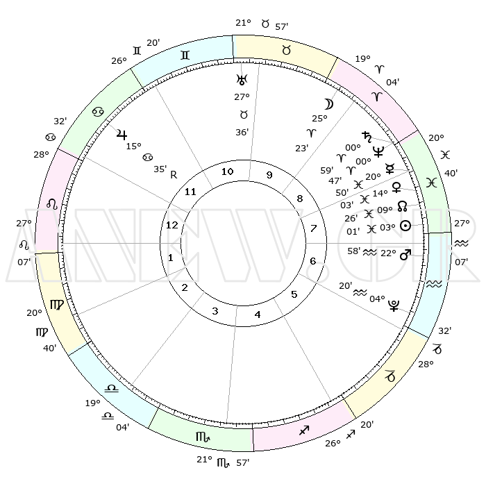 | | ΘΕΣΕΙΣ ΠΛΑΝΗΤΩΝ ΑΣΤΡΟΛΟΓΙΚΟΥ ΧΑΡΤΗ ΤΗΣ ΣΤΙΓΜΗΣ ΑΥΤΗΣ | | | | Πλανήτης | Ζώδιο | Μοίρες | Δεκαήμ. | Σε οίκο | Απόκλιση | | Ακμές των οίκων | | Ηλιος | Ιχθείς | 02°57' | Πρώτο | 8 | 10 S 25 | | 1ος | 07°00' | Λέων | | Σελήνη | Κριός | 24°25' | Τρίτο | 9 | 12 N 58 | | 2ος | 28°34' | Λέων | | Ερμής | Ιχθείς | 20°47' | Τρίτο | 8 | 02 S 08 | | 3ος | 24°34' | Παρθένος | | Αφροδίτη | Ιχθείς | 13°58' | Δεύτερο | 8 | 07 S 38 | | 4ος | 26°22' | Ζυγός | | Αρης | Υδροχόος | 22°55' | Τρίτο | 7 | 14 S 54 | | 5ος | 02°09' | Τοξότης | | Δίας | Καρκίνος | 15°35'R | Δεύτερο | 12 | 22 N 51 | | 6ος | 06°45' | Αιγόκερως | | Κρόνος | Κριός | 00°58' | Πρώτο | 9 | 01 S 35 | | 7ος | 07°00' | Υδροχόος | | Ουρανός | Ταύρος | 27°36' | Τρίτο | 10 | 19 N 26 | | 8ος | 28°34' | Υδροχόος | | Ποσειδώνας | Κριός | 00°47' | Πρώτο | 9 | 00 S 53 | | 9ος | 24°34' | Ιχθείς | | Πλούτωνας | Υδροχόος | 04°20' | Πρώτο | 6 | 22 S 54 | | 10ος | 26°22' | Κριός | | Β. Δεσμός | Ιχθείς | 09°26' | Πρώτο | 8 | 08 S 02 | | 11ος | 02°09' | Δίδυμοι | | Ωροσκόπος | Λέων | 07°00' | Πρώτο | | | 12ος | 06°45' | Καρκίνος | | Μεσουράνημα | Κριός | 26°22' | Τρίτο | | | |