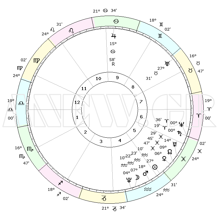 | | ΘΕΣΕΙΣ ΠΛΑΝΗΤΩΝ ΑΣΤΡΟΛΟΓΙΚΟΥ ΧΑΡΤΗ ΤΗΣ ΣΤΙΓΜΗΣ ΑΥΤΗΣ | | | | Πλανήτης | Ζώδιο | Μοίρες | Δεκαήμ. | Σε οίκο | Απόκλιση | | Ακμές των οίκων | | Ηλιος | Υδροχόος | 27°05' | Τρίτο | 5 | 12 S 29 | | 1ος | 28°34' | Παρθένος | | Σελήνη | Υδροχόος | 06°29' | Πρώτο | 5 | 21 S 24 | | 2ος | 25°03' | Ζυγός | | Ερμής | Ιχθείς | 14°23' | Δεύτερο | 6 | 05 S 57 | | 3ος | 25°25' | Σκορπιός | | Αφροδίτη | Ιχθείς | 06°42' | Πρώτο | 6 | 10 S 25 | | 4ος | 28°23' | Τοξότης | | Αρης | Υδροχόος | 18°20' | Δεύτερο | 5 | 16 S 21 | | 5ος | 01°23' | Υδροχόος | | Δίας | Καρκίνος | 15°58'R | Δεύτερο | 10 | 22 N 48 | | 6ος | 01°52' | Ιχθείς | | Κρόνος | Κριός | 00°19' | Πρώτο | 7 | 01 S 51 | | 7ος | 28°34' | Ιχθείς | | Ουρανός | Ταύρος | 27°31' | Τρίτο | 9 | 19 N 25 | | 8ος | 25°03' | Κριός | | Ποσειδώνας | Κριός | 00°36' | Πρώτο | 7 | 00 S 58 | | 9ος | 25°25' | Ταύρος | | Πλούτωνας | Υδροχόος | 04°10' | Πρώτο | 5 | 22 S 56 | | 10ος | 28°23' | Δίδυμοι | | Β. Δεσμός | Ιχθείς | 09°45' | Πρώτο | 6 | 07 S 55 | | 11ος | 01°23' | Λέων | | Ωροσκόπος | Παρθένος | 28°34' | Τρίτο | | | 12ος | 01°52' | Παρθένος | | Μεσουράνημα | Δίδυμοι | 28°23' | Τρίτο | | | |