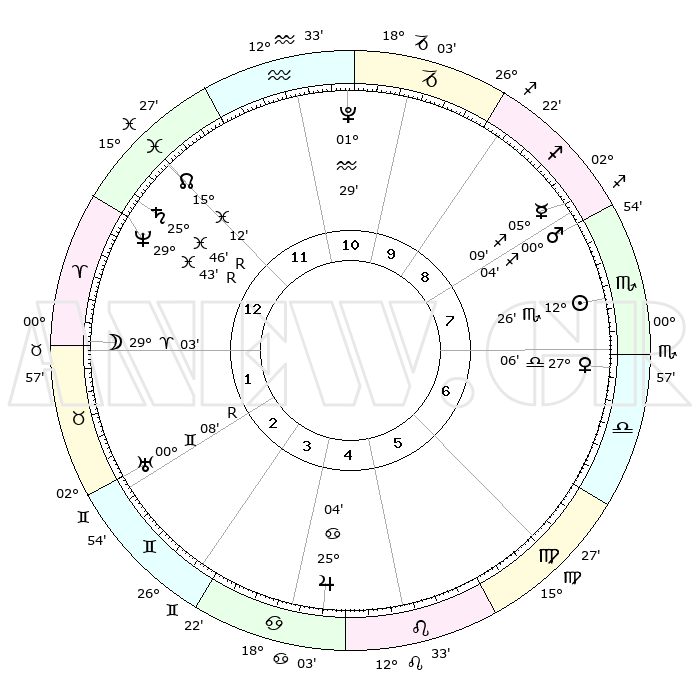|  | ΘΕΣΕΙΣ ΠΛΑΝΗΤΩΝ ΑΣΤΡΟΛΟΓΙΚΟΥ ΧΑΡΤΗ ΤΗΣ ΣΤΙΓΜΗΣ ΑΥΤΗΣ |  |   |  | Πλανήτης | Ζώδιο | Μοίρες | Δεκαήμ. | Σε οίκο | Απόκλιση |   | Ακμές των οίκων |  | Ηλιος | Σκορπιός | 12°14' | Δεύτερο | 10 | 15 S 30 |   | 1ος | 16°27' | Αιγόκερως |  | Σελήνη | Κριός | 25°59' | Τρίτο | 3 | 13 N 02 |   | 2ος | 27°46' | Υδροχόος |  | Ερμής | Τοξότης | 05°02' | Πρώτο | 11 | 23 S 56 |   | 3ος | 07°47' | Κριός |  | Αφροδίτη | Ζυγός | 26°51' | Τρίτο | 9 | 09 S 01 |   | 4ος | 08°45' | Ταύρος |  | Αρης | Σκορπιός | 29°55' | Τρίτο | 10 | 20 S 33 |   | 5ος | 02°47' | Δίδυμοι |  | Δίας | Καρκίνος | 25°04' | Τρίτο | 7 | 21 N 12 |   | 6ος | 23°60' | Δίδυμοι |  | Κρόνος | Ιχθείς | 25°47'R | Τρίτο | 2 | 03 S 56 |   | 7ος | 16°27' | Καρκίνος |  | Ουρανός | Δίδυμοι | 00°08'R | Πρώτο | 4 | 19 N 58 |   | 8ος | 27°46' | Λέων |  | Ποσειδώνας | Ιχθείς | 29°43'R | Τρίτο | 2 | 01 S 22 |   | 9ος | 07°47' | Ζυγός |  | Πλούτωνας | Υδροχόος | 01°29' | Πρώτο | 1 | 23 S 30 |   | 10ος | 08°45' | Σκορπιός |  | Β. Δεσμός | Ιχθείς | 15°13' | Δεύτερο | 2 | 05 S 49 |   | 11ος | 02°47' | Τοξότης |  | Ωροσκόπος | Αιγόκερως | 16°27' | Δεύτερο |   |   | 12ος | 23°60' | Τοξότης |  | Μεσουράνημα | Σκορπιός | 08°45' | Πρώτο |   |   |   |