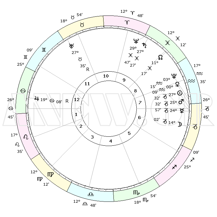 | | ΘΕΣΕΙΣ ΠΛΑΝΗΤΩΝ ΑΣΤΡΟΛΟΓΙΚΟΥ ΧΑΡΤΗ ΤΗΣ ΣΤΙΓΜΗΣ ΑΥΤΗΣ | | | | Πλανήτης | Ζώδιο | Μοίρες | Δεκαήμ. | Σε οίκο | Απόκλιση | | Ακμές των οίκων | | Ηλιος | Αιγόκερως | 27°27' | Τρίτο | 8 | 20 S 40 | | 1ος | 00°51' | Καρκίνος | | Σελήνη | Αιγόκερως | 12°60' | Δεύτερο | 7 | 27 S 04 | | 2ος | 21°36' | Καρκίνος | | Ερμής | Αιγόκερως | 24°49' | Τρίτο | 8 | 23 S 03 | | 3ος | 13°27' | Λέων | | Αφροδίτη | Υδροχόος | 00°03' | Πρώτο | 8 | 21 S 10 | | 4ος | 09°54' | Παρθένος | | Αρης | Αιγόκερως | 25°29' | Τρίτο | 8 | 22 S 00 | | 5ος | 13°58' | Ζυγός | | Δίας | Καρκίνος | 19°08'R | Δεύτερο | 1 | 22 N 20 | | 6ος | 23°55' | Σκορπιός | | Κρόνος | Ιχθείς | 27°27' | Τρίτο | 10 | 03 S 02 | | 7ος | 00°51' | Αιγόκερως | | Ουρανός | Ταύρος | 27°35'R | Τρίτο | 12 | 19 N 26 | | 8ος | 21°36' | Αιγόκερως | | Ποσειδώνας | Ιχθείς | 29°47' | Τρίτο | 10 | 01 S 18 | | 9ος | 13°27' | Υδροχόος | | Πλούτωνας | Υδροχόος | 03°14' | Πρώτο | 8 | 23 S 07 | | 10ος | 09°54' | Ιχθείς | | Β. Δεσμός | Ιχθείς | 11°18' | Δεύτερο | 10 | 07 S 20 | | 11ος | 13°58' | Κριός | | Ωροσκόπος | Καρκίνος | 00°51' | Πρώτο | | | 12ος | 23°55' | Ταύρος | | Μεσουράνημα | Ιχθείς | 09°54' | Πρώτο | | | |