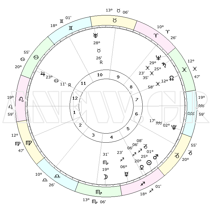 | | ΘΕΣΕΙΣ ΠΛΑΝΗΤΩΝ ΑΣΤΡΟΛΟΓΙΚΟΥ ΧΑΡΤΗ ΤΗΣ ΣΤΙΓΜΗΣ ΑΥΤΗΣ | | | | Πλανήτης | Ζώδιο | Μοίρες | Δεκαήμ. | Σε οίκο | Απόκλιση | | Ακμές των οίκων | | Ηλιος | Τοξότης | 24°45' | Τρίτο | 9 | 23 S 20 | | 1ος | 08°15' | Κριός | | Σελήνη | Σκορπιός | 15°24' | Δεύτερο | 7 | 20 S 42 | | 2ος | 16°27' | Ταύρος | | Ερμής | Τοξότης | 05°54' | Πρώτο | 8 | 19 S 57 | | 3ος | 12°39' | Δίδυμοι | | Αφροδίτη | Τοξότης | 19°40' | Δεύτερο | 9 | 22 S 56 | | 4ος | 04°38' | Καρκίνος | | Αρης | Αιγόκερως | 00°53' | Πρώτο | 9 | 24 S 13 | | 5ος | 27°22' | Καρκίνος | | Δίας | Καρκίνος | 23°13'R | Τρίτο | 4 | 21 N 38 | | 6ος | 26°05' | Λέων | | Κρόνος | Ιχθείς | 25°35' | Τρίτο | 12 | 03 S 53 | | 7ος | 08°15' | Ζυγός | | Ουρανός | Ταύρος | 28°27'R | Τρίτο | 2 | 19 N 37 | | 8ος | 16°27' | Σκορπιός | | Ποσειδώνας | Ιχθείς | 29°23' | Τρίτο | 12 | 01 S 29 | | 9ος | 12°39' | Τοξότης | | Πλούτωνας | Υδροχόος | 02°17' | Πρώτο | 11 | 23 S 19 | | 10ος | 04°38' | Αιγόκερως | | Β. Δεσμός | Ιχθείς | 12°60' | Δεύτερο | 12 | 06 S 41 | | 11ος | 27°22' | Αιγόκερως | | Ωροσκόπος | Κριός | 08°15' | Πρώτο | | | 12ος | 26°05' | Υδροχόος | | Μεσουράνημα | Αιγόκερως | 04°38' | Πρώτο | | | |
