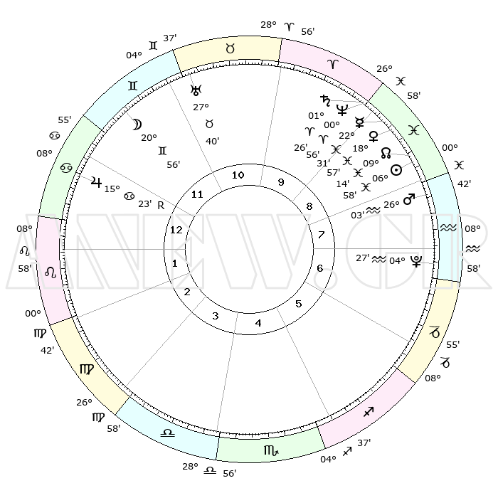 | | ΘΕΣΕΙΣ ΠΛΑΝΗΤΩΝ ΑΣΤΡΟΛΟΓΙΚΟΥ ΧΑΡΤΗ ΤΗΣ ΣΤΙΓΜΗΣ ΑΥΤΗΣ | | | | Πλανήτης | Ζώδιο | Μοίρες | Δεκαήμ. | Σε οίκο | Απόκλιση | | Ακμές των οίκων | | Ηλιος | Ιχθείς | 06°55' | Πρώτο | 9 | 08 S 58 | | 1ος | 20°51' | Καρκίνος | | Σελήνη | Δίδυμοι | 20°03' | Τρίτο | 12 | 28 N 14 | | 2ος | 11°25' | Λέων | | Ερμής | Ιχθείς | 22°31' | Τρίτο | 9 | 00 S 34 | | 3ος | 05°15' | Παρθένος | | Αφροδίτη | Ιχθείς | 18°53' | Δεύτερο | 9 | 05 S 42 | | 4ος | 05°00' | Ζυγός | | Αρης | Υδροχόος | 26°00' | Τρίτο | 8 | 13 S 53 | | 5ος | 11°01' | Σκορπιός | | Δίας | Καρκίνος | 15°23'R | Δεύτερο | 12 | 22 N 53 | | 6ος | 18°16' | Τοξότης | | Κρόνος | Κριός | 01°26' | Πρώτο | 9 | 01 S 24 | | 7ος | 20°51' | Αιγόκερως | | Ουρανός | Ταύρος | 27°40' | Τρίτο | 11 | 19 N 27 | | 8ος | 11°25' | Υδροχόος | | Ποσειδώνας | Κριός | 00°56' | Πρώτο | 9 | 00 S 50 | | 9ος | 05°15' | Ιχθείς | | Πλούτωνας | Υδροχόος | 04°26' | Πρώτο | 7 | 22 S 53 | | 10ος | 05°00' | Κριός | | Β. Δεσμός | Ιχθείς | 09°14' | Πρώτο | 9 | 08 S 06 | | 11ος | 11°01' | Ταύρος | | Ωροσκόπος | Καρκίνος | 20°51' | Τρίτο | | | 12ος | 18°16' | Δίδυμοι | | Μεσουράνημα | Κριός | 05°00' | Πρώτο | | | |
