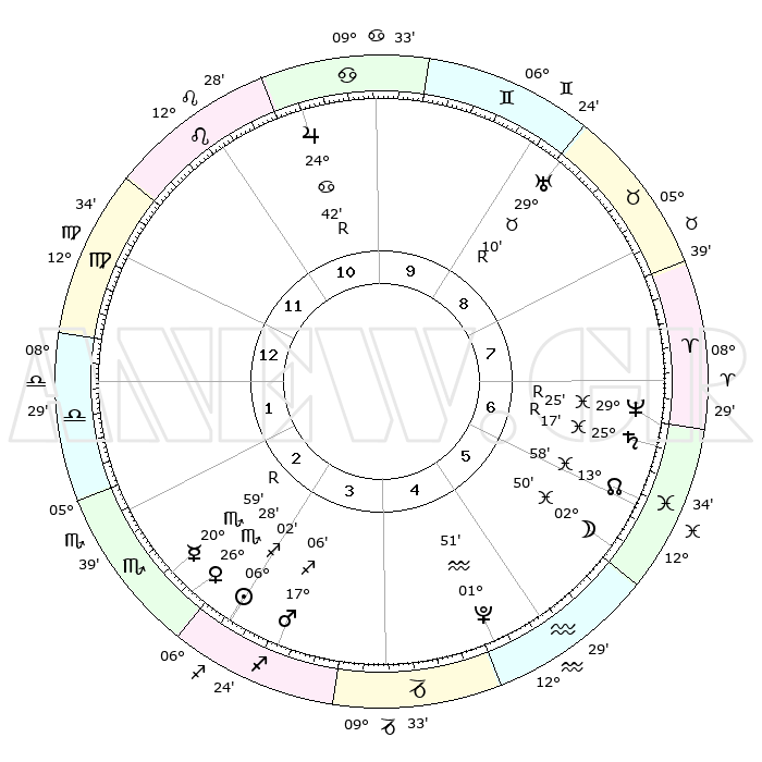 | | ΘΕΣΕΙΣ ΠΛΑΝΗΤΩΝ ΑΣΤΡΟΛΟΓΙΚΟΥ ΧΑΡΤΗ ΤΗΣ ΣΤΙΓΜΗΣ ΑΥΤΗΣ | | | | Πλανήτης | Ζώδιο | Μοίρες | Δεκαήμ. | Σε οίκο | Απόκλιση | | Ακμές των οίκων | | Ηλιος | Τοξότης | 06°00' | Πρώτο | 3 | 21 S 18 | | 1ος | 00°54' | Ζυγός | | Σελήνη | Ιχθείς | 02°30' | Πρώτο | 5 | 11 S 33 | | 2ος | 27°34' | Ζυγός | | Ερμής | Σκορπιός | 20°59'R | Τρίτο | 2 | 15 S 41 | | 3ος | 28°02' | Σκορπιός | | Αφροδίτη | Σκορπιός | 26°26' | Τρίτο | 2 | 18 S 34 | | 4ος | 01°01' | Αιγόκερως | | Αρης | Τοξότης | 17°05' | Δεύτερο | 3 | 23 S 26 | | 5ος | 03°59' | Υδροχόος | | Δίας | Καρκίνος | 24°42'R | Τρίτο | 10 | 21 N 20 | | 6ος | 04°23' | Ιχθείς | | Κρόνος | Ιχθείς | 25°17'R | Τρίτο | 6 | 04 S 04 | | 7ος | 00°54' | Κριός | | Ουρανός | Ταύρος | 29°10'R | Τρίτο | 9 | 19 N 46 | | 8ος | 27°34' | Κριός | | Ποσειδώνας | Ιχθείς | 29°25'R | Τρίτο | 6 | 01 S 29 | | 9ος | 28°02' | Ταύρος | | Πλούτωνας | Υδροχόος | 01°51' | Πρώτο | 4 | 23 S 25 | | 10ος | 01°01' | Καρκίνος | | Β. Δεσμός | Ιχθείς | 13°58' | Δεύτερο | 6 | 06 S 18 | | 11ος | 03°59' | Λέων | | Ωροσκόπος | Ζυγός | 00°54' | Πρώτο | | | 12ος | 04°23' | Παρθένος | | Μεσουράνημα | Καρκίνος | 01°01' | Πρώτο | | | |