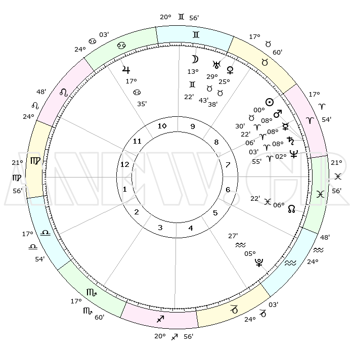 | | ΘΕΣΕΙΣ ΠΛΑΝΗΤΩΝ ΑΣΤΡΟΛΟΓΙΚΟΥ ΧΑΡΤΗ ΤΗΣ ΣΤΙΓΜΗΣ ΑΥΤΗΣ | | | | Πλανήτης | Ζώδιο | Μοίρες | Δεκαήμ. | Σε οίκο | Απόκλιση | | Ακμές των οίκων | | Ηλιος | Ταύρος | 00°27' | Πρώτο | 9 | 11 N 38 | | 1ος | 05°38' | Παρθένος | | Σελήνη | Δίδυμοι | 12°32' | Δεύτερο | 10 | 27 N 20 | | 2ος | 00°04' | Ζυγός | | Ερμής | Κριός | 08°01' | Πρώτο | 8 | 00 N 47 | | 3ος | 29°12' | Ζυγός | | Αφροδίτη | Ταύρος | 25°34' | Τρίτο | 9 | 19 N 34 | | 4ος | 02°09' | Τοξότης | | Αρης | Κριός | 08°19' | Πρώτο | 8 | 02 N 25 | | 5ος | 05°59' | Αιγόκερως | | Δίας | Καρκίνος | 17°34' | Δεύτερο | 11 | 22 N 40 | | 6ος | 07°33' | Υδροχόος | | Κρόνος | Κριός | 08°03' | Πρώτο | 8 | 01 N 13 | | 7ος | 05°38' | Ιχθείς | | Ουρανός | Ταύρος | 29°43' | Τρίτο | 9 | 19 N 55 | | 8ος | 00°04' | Κριός | | Ποσειδώνας | Κριός | 02°55' | Πρώτο | 8 | 00 S 03 | | 9ος | 29°12' | Κριός | | Πλούτωνας | Υδροχόος | 05°27' | Πρώτο | 5 | 22 S 48 | | 10ος | 02°09' | Δίδυμοι | | Β. Δεσμός | Ιχθείς | 06°22' | Πρώτο | 7 | 09 S 10 | | 11ος | 05°59' | Καρκίνος | | Ωροσκόπος | Παρθένος | 05°38' | Πρώτο | | | 12ος | 07°33' | Λέων | | Μεσουράνημα | Δίδυμοι | 02°09' | Πρώτο | | | |