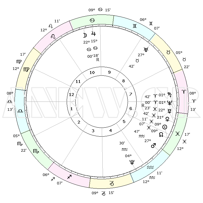 | | ΘΕΣΕΙΣ ΠΛΑΝΗΤΩΝ ΑΣΤΡΟΛΟΓΙΚΟΥ ΧΑΡΤΗ ΤΗΣ ΣΤΙΓΜΗΣ ΑΥΤΗΣ | | | | Πλανήτης | Ζώδιο | Μοίρες | Δεκαήμ. | Σε οίκο | Απόκλιση | | Ακμές των οίκων | | Ηλιος | Ιχθείς | 09°07' | Πρώτο | 6 | 08 S 09 | | 1ος | 20°49' | Παρθένος | | Σελήνη | Καρκίνος | 21°10' | Τρίτο | 10 | 25 N 38 | | 2ος | 16°41' | Ζυγός | | Ερμής | Ιχθείς | 22°24'R | Τρίτο | 7 | 00 S 11 | | 3ος | 16°44' | Σκορπιός | | Αφροδίτη | Ιχθείς | 21°37' | Τρίτο | 7 | 04 S 35 | | 4ος | 19°40' | Τοξότης | | Αρης | Υδροχόος | 27°44' | Τρίτο | 6 | 13 S 17 | | 5ος | 22°49' | Αιγόκερως | | Δίας | Καρκίνος | 15°18'R | Δεύτερο | 10 | 22 N 54 | | 6ος | 23°37' | Υδροχόος | | Κρόνος | Κριός | 01°41' | Πρώτο | 7 | 01 S 17 | | 7ος | 20°49' | Ιχθείς | | Ουρανός | Ταύρος | 27°42' | Τρίτο | 9 | 19 N 28 | | 8ος | 16°41' | Κριός | | Ποσειδώνας | Κριός | 01°00' | Πρώτο | 7 | 00 S 48 | | 9ος | 16°44' | Ταύρος | | Πλούτωνας | Υδροχόος | 04°30' | Πρώτο | 5 | 22 S 53 | | 10ος | 19°40' | Δίδυμοι | | Β. Δεσμός | Ιχθείς | 09°07' | Πρώτο | 6 | 08 S 09 | | 11ος | 22°50' | Καρκίνος | | Ωροσκόπος | Παρθένος | 20°49' | Τρίτο | | | 12ος | 23°37' | Λέων | | Μεσουράνημα | Δίδυμοι | 19°40' | Δεύτερο | | | |