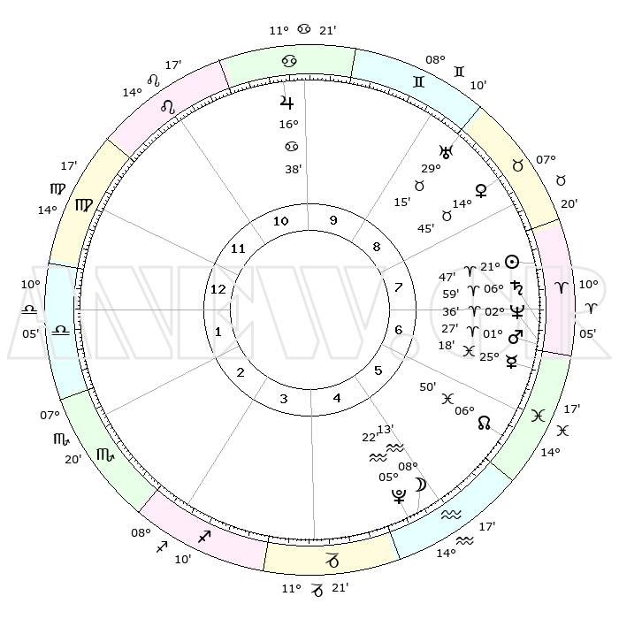 | | ΘΕΣΕΙΣ ΠΛΑΝΗΤΩΝ ΑΣΤΡΟΛΟΓΙΚΟΥ ΧΑΡΤΗ ΤΗΣ ΣΤΙΓΜΗΣ ΑΥΤΗΣ | | | | Πλανήτης | Ζώδιο | Μοίρες | Δεκαήμ. | Σε οίκο | Απόκλιση | | Ακμές των οίκων | | Ηλιος | Κριός | 21°43' | Τρίτο | 8 | 08 N 28 | | 1ος | 20°38' | Παρθένος | | Σελήνη | Υδροχόος | 07°24' | Πρώτο | 5 | 20 S 58 | | 2ος | 16°29' | Ζυγός | | Ερμής | Ιχθείς | 25°13' | Τρίτο | 7 | 04 S 08 | | 3ος | 16°31' | Σκορπιός | | Αφροδίτη | Ταύρος | 14°40' | Δεύτερο | 8 | 16 N 15 | | 4ος | 19°27' | Τοξότης | | Αρης | Κριός | 01°24' | Πρώτο | 7 | 00 S 22 | | 5ος | 22°37' | Αιγόκερως | | Δίας | Καρκίνος | 16°38' | Δεύτερο | 10 | 22 N 46 | | 6ος | 23°25' | Υδροχόος | | Κρόνος | Κριός | 06°58' | Πρώτο | 7 | 00 N 48 | | 7ος | 20°38' | Ιχθείς | | Ουρανός | Ταύρος | 29°15' | Τρίτο | 9 | 19 N 49 | | 8ος | 16°29' | Κριός | | Ποσειδώνας | Κριός | 02°36' | Πρώτο | 7 | 00 S 10 | | 9ος | 16°31' | Ταύρος | | Πλούτωνας | Υδροχόος | 05°22' | Πρώτο | 5 | 22 S 47 | | 10ος | 19°27' | Δίδυμοι | | Β. Δεσμός | Ιχθείς | 06°51' | Πρώτο | 6 | 09 S 00 | | 11ος | 22°37' | Καρκίνος | | Ωροσκόπος | Παρθένος | 20°38' | Τρίτο | | | 12ος | 23°25' | Λέων | | Μεσουράνημα | Δίδυμοι | 19°27' | Δεύτερο | | | |