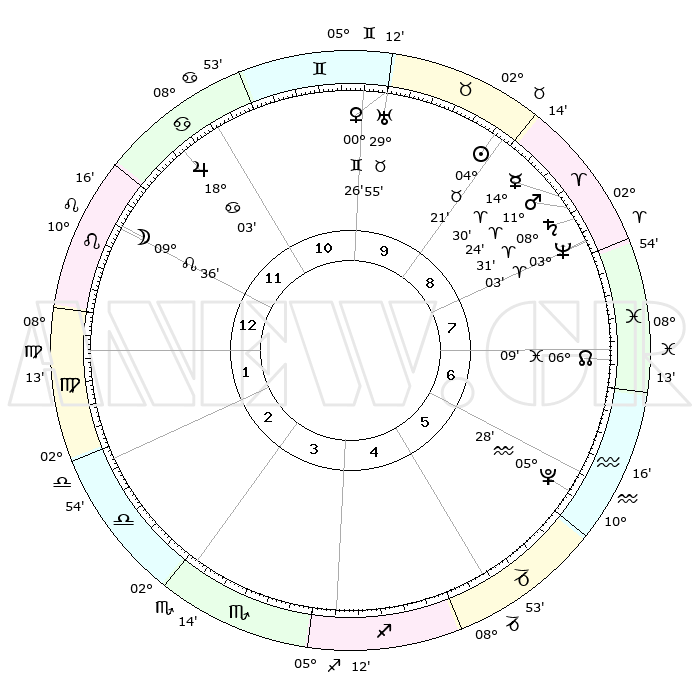 | | ΘΕΣΕΙΣ ΠΛΑΝΗΤΩΝ ΑΣΤΡΟΛΟΓΙΚΟΥ ΧΑΡΤΗ ΤΗΣ ΣΤΙΓΜΗΣ ΑΥΤΗΣ | | | | Πλανήτης | Ζώδιο | Μοίρες | Δεκαήμ. | Σε οίκο | Απόκλιση | | Ακμές των οίκων | | Ηλιος | Ταύρος | 04°17' | Πρώτο | 9 | 12 N 57 | | 1ος | 20°38' | Λέων | | Σελήνη | Λέων | 08°47' | Πρώτο | 12 | 20 N 25 | | 2ος | 13°30' | Παρθένος | | Ερμής | Κριός | 14°24' | Δεύτερο | 9 | 03 N 24 | | 3ος | 11°13' | Ζυγός | | Αφροδίτη | Δίδυμοι | 00°22' | Πρώτο | 10 | 20 N 49 | | 4ος | 13°55' | Σκορπιός | | Αρης | Κριός | 11°21' | Δεύτερο | 9 | 03 N 38 | | 5ος | 18°47' | Τοξότης | | Δίας | Καρκίνος | 18°03' | Δεύτερο | 11 | 22 N 36 | | 6ος | 21°36' | Αιγόκερως | | Κρόνος | Κριός | 08°31' | Πρώτο | 8 | 01 N 23 | | 7ος | 20°38' | Υδροχόος | | Ουρανός | Ταύρος | 29°55' | Τρίτο | 10 | 19 N 58 | | 8ος | 13°30' | Ιχθείς | | Ποσειδώνας | Κριός | 03°03' | Πρώτο | 8 | 00 N 00 | | 9ος | 11°13' | Κριός | | Πλούτωνας | Υδροχόος | 05°28' | Πρώτο | 6 | 22 S 48 | | 10ος | 13°55' | Ταύρος | | Β. Δεσμός | Ιχθείς | 06°10' | Πρώτο | 7 | 09 S 15 | | 11ος | 18°47' | Δίδυμοι | | Ωροσκόπος | Λέων | 20°38' | Τρίτο | | | 12ος | 21°36' | Καρκίνος | | Μεσουράνημα | Ταύρος | 13°55' | Δεύτερο | | | |