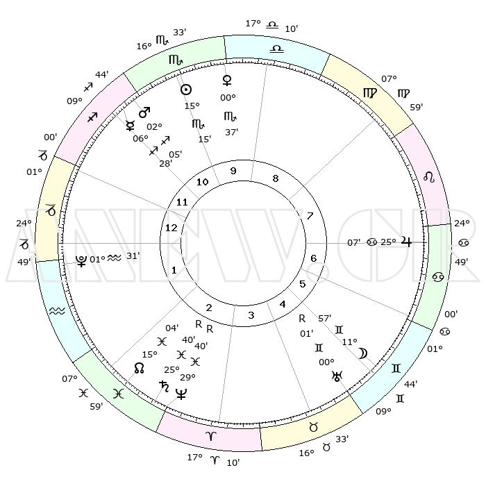 | | ΘΕΣΕΙΣ ΠΛΑΝΗΤΩΝ ΑΣΤΡΟΛΟΓΙΚΟΥ ΧΑΡΤΗ ΤΗΣ ΣΤΙΓΜΗΣ ΑΥΤΗΣ | | | | Πλανήτης | Ζώδιο | Μοίρες | Δεκαήμ. | Σε οίκο | Απόκλιση | | Ακμές των οίκων | | Ηλιος | Σκορπιός | 15°09' | Δεύτερο | 11 | 16 S 23 | | 1ος | 18°55' | Τοξότης | | Σελήνη | Δίδυμοι | 10°24' | Δεύτερο | 6 | 26 N 59 | | 2ος | 23°25' | Αιγόκερως | | Ερμής | Τοξότης | 06°27' | Πρώτο | 12 | 24 S 00 | | 3ος | 02°13' | Ιχθείς | | Αφροδίτη | Σκορπιός | 00°29' | Πρώτο | 10 | 10 S 21 | | 4ος | 07°36' | Κριός | | Αρης | Τοξότης | 02°00' | Πρώτο | 12 | 21 S 00 | | 5ος | 05°45' | Ταύρος | | Δίας | Καρκίνος | 25°07' | Τρίτο | 8 | 21 N 12 | | 6ος | 28°29' | Ταύρος | | Κρόνος | Ιχθείς | 25°40'R | Τρίτο | 3 | 03 S 58 | | 7ος | 18°55' | Δίδυμοι | | Ουρανός | Δίδυμοι | 00°01'R | Πρώτο | 6 | 19 N 57 | | 8ος | 23°25' | Καρκίνος | | Ποσειδώνας | Ιχθείς | 29°40'R | Τρίτο | 3 | 01 S 23 | | 9ος | 02°13' | Παρθένος | | Πλούτωνας | Υδροχόος | 01°30' | Πρώτο | 2 | 23 S 30 | | 10ος | 07°36' | Ζυγός | | Β. Δεσμός | Ιχθείς | 15°04' | Δεύτερο | 3 | 05 S 53 | | 11ος | 05°45' | Σκορπιός | | Ωροσκόπος | Τοξότης | 18°55' | Δεύτερο | | | 12ος | 28°29' | Σκορπιός | | Μεσουράνημα | Ζυγός | 07°36' | Πρώτο | | | |