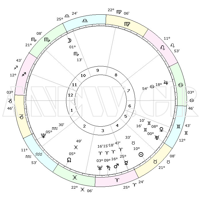 | | ΘΕΣΕΙΣ ΠΛΑΝΗΤΩΝ ΑΣΤΡΟΛΟΓΙΚΟΥ ΧΑΡΤΗ ΤΗΣ ΣΤΙΓΜΗΣ ΑΥΤΗΣ | | | | Πλανήτης | Ζώδιο | Μοίρες | Δεκαήμ. | Σε οίκο | Απόκλιση | | Ακμές των οίκων | | Ηλιος | Ταύρος | 10°30' | Δεύτερο | 5 | 14 N 58 | | 1ος | 19°21' | Τοξότης | | Σελήνη | Σκορπιός | 00°41' | Πρώτο | 10 | 15 S 31 | | 2ος | 23°58' | Αιγόκερως | | Ερμής | Κριός | 25°42' | Τρίτο | 4 | 08 N 07 | | 3ος | 02°49' | Ιχθείς | | Αφροδίτη | Δίδυμοι | 08°07' | Πρώτο | 6 | 22 N 32 | | 4ος | 08°10' | Κριός | | Αρης | Κριός | 16°16' | Δεύτερο | 4 | 05 N 35 | | 5ος | 06°15' | Ταύρος | | Δίας | Καρκίνος | 18°54' | Δεύτερο | 7 | 22 N 29 | | 6ος | 28°56' | Ταύρος | | Κρόνος | Κριός | 09°15' | Πρώτο | 4 | 01 N 40 | | 7ος | 19°21' | Δίδυμοι | | Ουρανός | Δίδυμοι | 00°16' | Πρώτο | 6 | 20 N 02 | | 8ος | 23°58' | Καρκίνος | | Ποσειδώνας | Κριός | 03°16' | Πρώτο | 3 | 00 N 05 | | 9ος | 02°49' | Παρθένος | | Πλούτωνας | Υδροχόος | 05°30' | Πρώτο | 2 | 22 S 49 | | 10ος | 08°10' | Ζυγός | | Β. Δεσμός | Ιχθείς | 05°49' | Πρώτο | 3 | 09 S 22 | | 11ος | 06°15' | Σκορπιός | | Ωροσκόπος | Τοξότης | 19°21' | Δεύτερο | | | 12ος | 28°56' | Σκορπιός | | Μεσουράνημα | Ζυγός | 08°10' | Πρώτο | | | |
