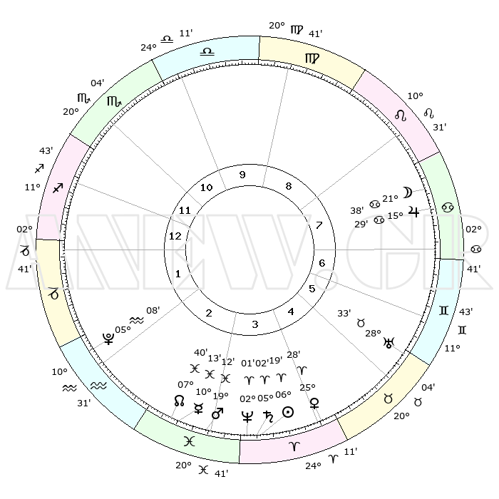 | | ΘΕΣΕΙΣ ΠΛΑΝΗΤΩΝ ΑΣΤΡΟΛΟΓΙΚΟΥ ΧΑΡΤΗ ΤΗΣ ΣΤΙΓΜΗΣ ΑΥΤΗΣ | | | | Πλανήτης | Ζώδιο | Μοίρες | Δεκαήμ. | Σε οίκο | Απόκλιση | | Ακμές των οίκων | | Ηλιος | Κριός | 06°15' | Πρώτο | 4 | 02 N 29 | | 1ος | 10°44' | Τοξότης | | Σελήνη | Καρκίνος | 20°40' | Τρίτο | 8 | 25 N 41 | | 2ος | 13°36' | Αιγόκερως | | Ερμής | Ιχθείς | 10°11' | Δεύτερο | 3 | 08 S 07 | | 3ος | 21°07' | Υδροχόος | | Αφροδίτη | Κριός | 25°23' | Τρίτο | 4 | 09 N 13 | | 4ος | 27°05' | Ιχθείς | | Αρης | Ιχθείς | 19°09' | Δεύτερο | 3 | 05 S 16 | | 5ος | 26°34' | Κριός | | Δίας | Καρκίνος | 15°29' | Δεύτερο | 8 | 22 N 54 | | 6ος | 20°13' | Ταύρος | | Κρόνος | Κριός | 05°02' | Πρώτο | 4 | 00 N 03 | | 7ος | 10°44' | Δίδυμοι | | Ουρανός | Ταύρος | 28°33' | Τρίτο | 6 | 19 N 40 | | 8ος | 13°36' | Καρκίνος | | Ποσειδώνας | Κριός | 02°01' | Πρώτο | 4 | 00 S 24 | | 9ος | 21°07' | Λέων | | Πλούτωνας | Υδροχόος | 05°08' | Πρώτο | 2 | 22 S 48 | | 10ος | 27°05' | Παρθένος | | Β. Δεσμός | Ιχθείς | 07°40' | Πρώτο | 3 | 08 S 41 | | 11ος | 26°34' | Ζυγός | | Ωροσκόπος | Τοξότης | 10°44' | Δεύτερο | | | 12ος | 20°13' | Σκορπιός | | Μεσουράνημα | Παρθένος | 27°05' | Τρίτο | | | |