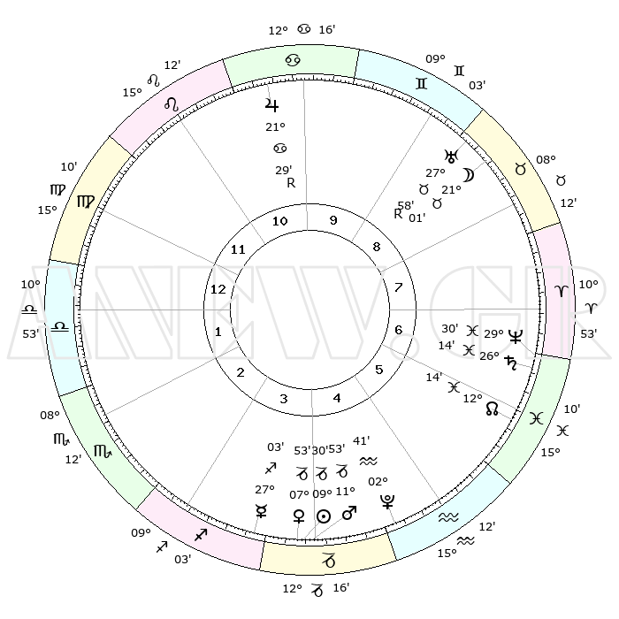 | | ΘΕΣΕΙΣ ΠΛΑΝΗΤΩΝ ΑΣΤΡΟΛΟΓΙΚΟΥ ΧΑΡΤΗ ΤΗΣ ΣΤΙΓΜΗΣ ΑΥΤΗΣ | | | | Πλανήτης | Ζώδιο | Μοίρες | Δεκαήμ. | Σε οίκο | Απόκλιση | | Ακμές των οίκων | | Ηλιος | Αιγόκερως | 09°25' | Πρώτο | 4 | 23 S 06 | | 1ος | 19°11' | Παρθένος | | Σελήνη | Ταύρος | 19°56' | Δεύτερο | 9 | 22 N 16 | | 2ος | 14°55' | Ζυγός | | Ερμής | Τοξότης | 26°57' | Τρίτο | 4 | 23 S 51 | | 3ος | 14°53' | Σκορπιός | | Αφροδίτη | Αιγόκερως | 07°48' | Πρώτο | 4 | 23 S 40 | | 4ος | 17°49' | Τοξότης | | Αρης | Αιγόκερως | 11°50' | Δεύτερο | 4 | 23 S 47 | | 5ος | 21°02' | Αιγόκερως | | Δίας | Καρκίνος | 21°30'R | Τρίτο | 11 | 21 N 57 | | 6ος | 21°53' | Υδροχόος | | Κρόνος | Ιχθείς | 26°13' | Τρίτο | 7 | 03 S 35 | | 7ος | 19°11' | Ιχθείς | | Ουρανός | Ταύρος | 27°59'R | Τρίτο | 9 | 19 N 31 | | 8ος | 14°55' | Κριός | | Ποσειδώνας | Ιχθείς | 29°30' | Τρίτο | 7 | 01 S 25 | | 9ος | 14°53' | Ταύρος | | Πλούτωνας | Υδροχόος | 02°41' | Πρώτο | 5 | 23 S 14 | | 10ος | 17°49' | Δίδυμοι | | Β. Δεσμός | Ιχθείς | 12°14' | Δεύτερο | 6 | 06 S 58 | | 11ος | 21°02' | Καρκίνος | | Ωροσκόπος | Παρθένος | 19°11' | Δεύτερο | | | 12ος | 21°53' | Λέων | | Μεσουράνημα | Δίδυμοι | 17°49' | Δεύτερο | | | |