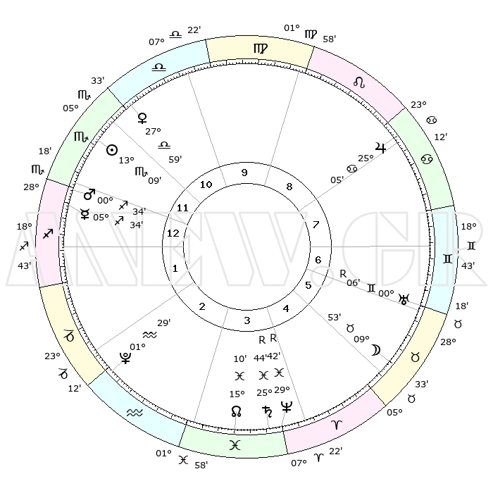 | | ΘΕΣΕΙΣ ΠΛΑΝΗΤΩΝ ΑΣΤΡΟΛΟΓΙΚΟΥ ΧΑΡΤΗ ΤΗΣ ΣΤΙΓΜΗΣ ΑΥΤΗΣ | | | | Πλανήτης | Ζώδιο | Μοίρες | Δεκαήμ. | Σε οίκο | Απόκλιση | | Ακμές των οίκων | | Ηλιος | Σκορπιός | 13°01' | Δεύτερο | 1 | 15 S 44 | | 1ος | 06°25' | Σκορπιός | | Σελήνη | Ταύρος | 07°41' | Πρώτο | 7 | 17 N 48 | | 2ος | 05°14' | Τοξότης | | Ερμής | Τοξότης | 05°29' | Πρώτο | 2 | 23 S 59 | | 3ος | 07°46' | Αιγόκερως | | Αφροδίτη | Ζυγός | 27°49' | Τρίτο | 12 | 09 S 22 | | 4ος | 12°25' | Υδροχόος | | Αρης | Τοξότης | 00°28' | Πρώτο | 1 | 20 S 40 | | 5ος | 15°12' | Ιχθείς | | Δίας | Καρκίνος | 25°05' | Τρίτο | 9 | 21 N 12 | | 6ος | 13°14' | Κριός | | Κρόνος | Ιχθείς | 25°45'R | Τρίτο | 5 | 03 S 57 | | 7ος | 06°25' | Ταύρος | | Ουρανός | Δίδυμοι | 00°07'R | Πρώτο | 7 | 19 N 58 | | 8ος | 05°14' | Δίδυμοι | | Ποσειδώνας | Ιχθείς | 29°43'R | Τρίτο | 5 | 01 S 22 | | 9ος | 07°46' | Καρκίνος | | Πλούτωνας | Υδροχόος | 01°29' | Πρώτο | 3 | 23 S 30 | | 10ος | 12°25' | Λέων | | Β. Δεσμός | Ιχθείς | 15°11' | Δεύτερο | 4 | 05 S 50 | | 11ος | 15°12' | Παρθένος | | Ωροσκόπος | Σκορπιός | 06°25' | Πρώτο | | | 12ος | 13°14' | Ζυγός | | Μεσουράνημα | Λέων | 12°25' | Δεύτερο | | | |