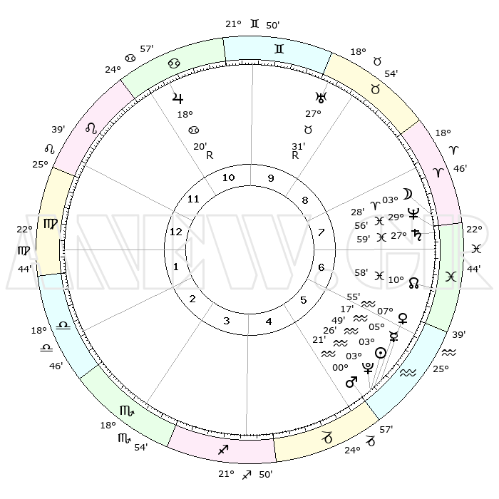 | | ΘΕΣΕΙΣ ΠΛΑΝΗΤΩΝ ΑΣΤΡΟΛΟΓΙΚΟΥ ΧΑΡΤΗ ΤΗΣ ΣΤΙΓΜΗΣ ΑΥΤΗΣ | | | | Πλανήτης | Ζώδιο | Μοίρες | Δεκαήμ. | Σε οίκο | Απόκλιση | | Ακμές των οίκων | | Ηλιος | Υδροχόος | 03°45' | Πρώτο | 5 | 19 S 18 | | 1ος | 06°25' | Παρθένος | | Σελήνη | Κριός | 02°43' | Πρώτο | 8 | 02 N 59 | | 2ος | 00°57' | Ζυγός | | Ερμής | Υδροχόος | 05°11' | Πρώτο | 5 | 20 S 59 | | 3ος | 00°09' | Σκορπιός | | Αφροδίτη | Υδροχόος | 07°51' | Πρώτο | 5 | 19 S 28 | | 4ος | 03°06' | Τοξότης | | Αρης | Υδροχόος | 00°18' | Πρώτο | 5 | 21 S 04 | | 5ος | 06°53' | Αιγόκερως | | Δίας | Καρκίνος | 18°20'R | Δεύτερο | 11 | 22 N 28 | | 6ος | 08°23' | Υδροχόος | | Κρόνος | Ιχθείς | 27°59' | Τρίτο | 7 | 02 S 49 | | 7ος | 06°25' | Ιχθείς | | Ουρανός | Ταύρος | 27°31'R | Τρίτο | 9 | 19 N 25 | | 8ος | 00°57' | Κριός | | Ποσειδώνας | Ιχθείς | 29°56' | Τρίτο | 7 | 01 S 14 | | 9ος | 00°09' | Ταύρος | | Πλούτωνας | Υδροχόος | 03°26' | Πρώτο | 5 | 23 S 04 | | 10ος | 03°06' | Δίδυμοι | | Β. Δεσμός | Ιχθείς | 10°58' | Δεύτερο | 7 | 07 S 27 | | 11ος | 06°53' | Καρκίνος | | Ωροσκόπος | Παρθένος | 06°25' | Πρώτο | | | 12ος | 08°23' | Λέων | | Μεσουράνημα | Δίδυμοι | 03°06' | Πρώτο | | | |