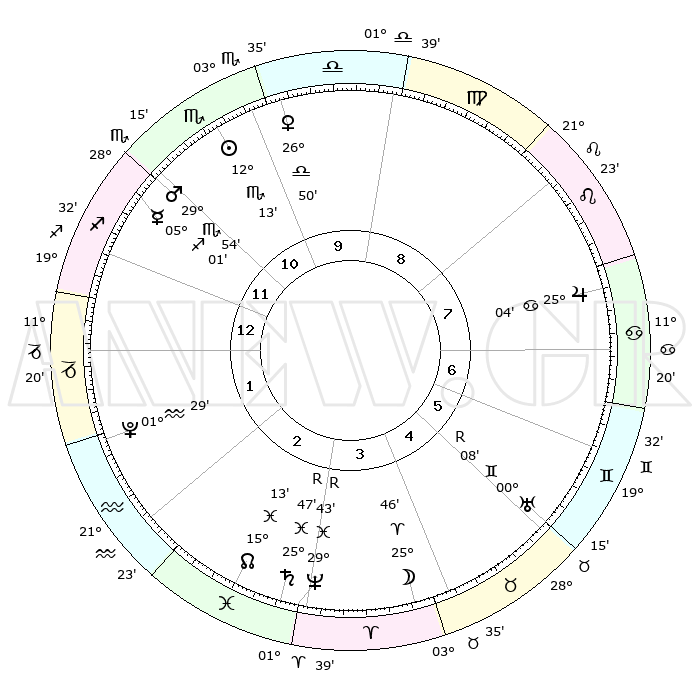 |  | ΘΕΣΕΙΣ ΠΛΑΝΗΤΩΝ ΑΣΤΡΟΛΟΓΙΚΟΥ ΧΑΡΤΗ ΤΗΣ ΣΤΙΓΜΗΣ ΑΥΤΗΣ |  |   |  | Πλανήτης | Ζώδιο | Μοίρες | Δεκαήμ. | Σε οίκο | Απόκλιση |   | Ακμές των οίκων |  | Ηλιος | Σκορπιός | 11°58' | Δεύτερο | 1 | 15 S 25 |   | 1ος | 23°30' | Ζυγός |  | Σελήνη | Κριός | 21°55' | Τρίτο | 6 | 11 N 15 |   | 2ος | 21°32' | Σκορπιός |  | Ερμής | Τοξότης | 04°52' | Πρώτο | 2 | 23 S 54 |   | 3ος | 23°02' | Τοξότης |  | Αφροδίτη | Ζυγός | 26°30' | Τρίτο | 1 | 08 S 53 |   | 4ος | 26°49' | Αιγόκερως |  | Αρης | Σκορπιός | 29°43' | Τρίτο | 2 | 20 S 30 |   | 5ος | 29°46' | Υδροχόος |  | Δίας | Καρκίνος | 25°03' | Τρίτο | 9 | 21 N 12 |   | 6ος | 28°58' | Ιχθείς |  | Κρόνος | Ιχθείς | 25°47'R | Τρίτο | 5 | 03 S 56 |   | 7ος | 23°30' | Κριός |  | Ουρανός | Δίδυμοι | 00°09'R | Πρώτο | 8 | 19 N 58 |   | 8ος | 21°32' | Ταύρος |  | Ποσειδώνας | Ιχθείς | 29°44'R | Τρίτο | 6 | 01 S 22 |   | 9ος | 23°02' | Δίδυμοι |  | Πλούτωνας | Υδροχόος | 01°28' | Πρώτο | 4 | 23 S 30 |   | 10ος | 26°49' | Καρκίνος |  | Β. Δεσμός | Ιχθείς | 15°14' | Δεύτερο | 5 | 05 S 49 |   | 11ος | 29°46' | Λέων |  | Ωροσκόπος | Ζυγός | 23°30' | Τρίτο |   |   | 12ος | 28°58' | Παρθένος |  | Μεσουράνημα | Καρκίνος | 26°49' | Τρίτο |   |   |   |