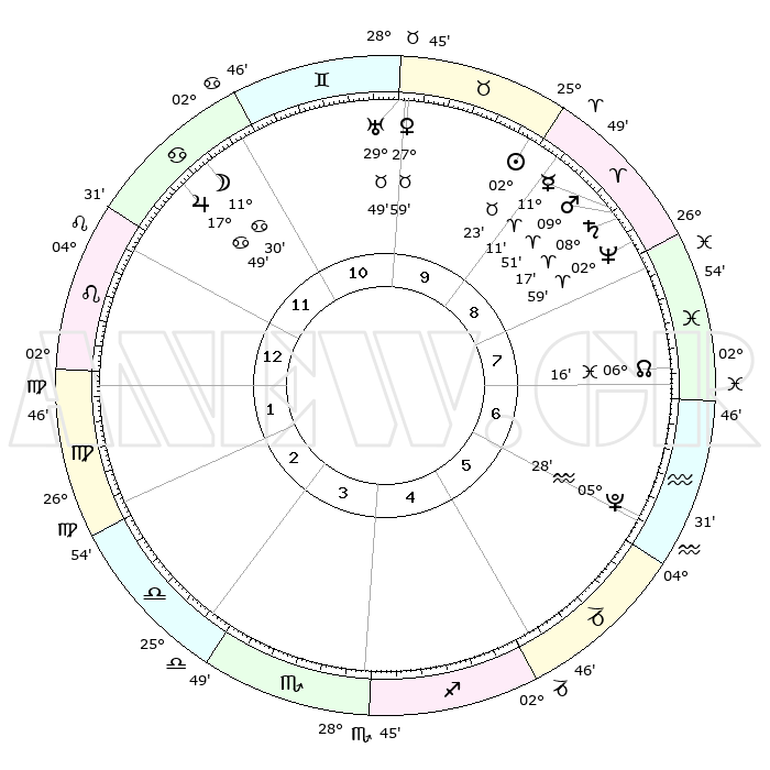 | | ΘΕΣΕΙΣ ΠΛΑΝΗΤΩΝ ΑΣΤΡΟΛΟΓΙΚΟΥ ΧΑΡΤΗ ΤΗΣ ΣΤΙΓΜΗΣ ΑΥΤΗΣ | | | | Πλανήτης | Ζώδιο | Μοίρες | Δεκαήμ. | Σε οίκο | Απόκλιση | | Ακμές των οίκων | | Ηλιος | Ταύρος | 02°20' | Πρώτο | 9 | 12 N 17 | | 1ος | 14°38' | Λέων | | Σελήνη | Καρκίνος | 10°36' | Δεύτερο | 11 | 27 N 16 | | 2ος | 06°54' | Παρθένος | | Ερμής | Κριός | 11°04' | Δεύτερο | 9 | 02 N 02 | | 3ος | 03°53' | Ζυγός | | Αφροδίτη | Ταύρος | 27°55' | Τρίτο | 10 | 20 N 11 | | 4ος | 06°17' | Σκορπιός | | Αρης | Κριός | 09°48' | Πρώτο | 9 | 03 N 01 | | 5ος | 11°35' | Τοξότης | | Δίας | Καρκίνος | 17°48' | Δεύτερο | 12 | 22 N 38 | | 6ος | 15°07' | Αιγόκερως | | Κρόνος | Κριός | 08°16' | Πρώτο | 9 | 01 N 18 | | 7ος | 14°38' | Υδροχόος | | Ουρανός | Ταύρος | 29°49' | Τρίτο | 10 | 19 N 57 | | 8ος | 06°54' | Ιχθείς | | Ποσειδώνας | Κριός | 02°59' | Πρώτο | 8 | 00 S 01 | | 9ος | 03°53' | Κριός | | Πλούτωνας | Υδροχόος | 05°28' | Πρώτο | 6 | 22 S 48 | | 10ος | 06°17' | Ταύρος | | Β. Δεσμός | Ιχθείς | 06°16' | Πρώτο | 7 | 09 S 13 | | 11ος | 11°35' | Δίδυμοι | | Ωροσκόπος | Λέων | 14°38' | Δεύτερο | | | 12ος | 15°07' | Καρκίνος | | Μεσουράνημα | Ταύρος | 06°17' | Πρώτο | | | |