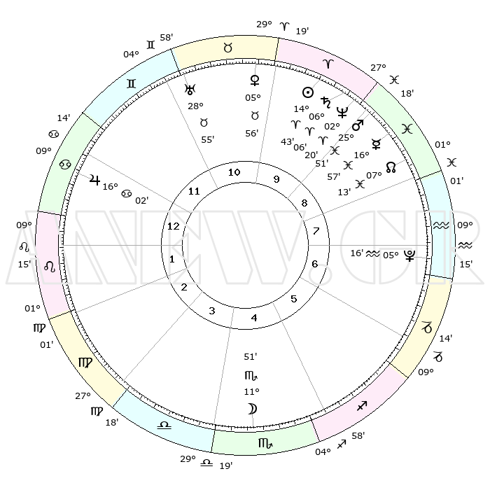 | | ΘΕΣΕΙΣ ΠΛΑΝΗΤΩΝ ΑΣΤΡΟΛΟΓΙΚΟΥ ΧΑΡΤΗ ΤΗΣ ΣΤΙΓΜΗΣ ΑΥΤΗΣ | | | | Πλανήτης | Ζώδιο | Μοίρες | Δεκαήμ. | Σε οίκο | Απόκλιση | | Ακμές των οίκων | | Ηλιος | Κριός | 14°39' | Δεύτερο | 10 | 05 N 46 | | 1ος | 21°45' | Καρκίνος | | Σελήνη | Σκορπιός | 11°07' | Δεύτερο | 4 | 19 S 31 | | 2ος | 12°21' | Λέων | | Ερμής | Ιχθείς | 16°53' | Δεύτερο | 9 | 06 S 49 | | 3ος | 06°19' | Παρθένος | | Αφροδίτη | Ταύρος | 05°51' | Πρώτο | 10 | 13 N 11 | | 4ος | 06°12' | Ζυγός | | Αρης | Ιχθείς | 25°48' | Τρίτο | 9 | 02 S 37 | | 5ος | 12°15' | Σκορπιός | | Δίας | Καρκίνος | 16°01' | Δεύτερο | 12 | 22 N 51 | | 6ος | 19°21' | Τοξότης | | Κρόνος | Κριός | 06°05' | Πρώτο | 9 | 00 N 27 | | 7ος | 21°45' | Αιγόκερως | | Ουρανός | Ταύρος | 28°55' | Τρίτο | 11 | 19 N 45 | | 8ος | 12°21' | Υδροχόος | | Ποσειδώνας | Κριός | 02°20' | Πρώτο | 9 | 00 S 16 | | 9ος | 06°19' | Ιχθείς | | Πλούτωνας | Υδροχόος | 05°16' | Πρώτο | 7 | 22 S 47 | | 10ος | 06°12' | Κριός | | Β. Δεσμός | Ιχθείς | 07°13' | Πρώτο | 9 | 08 S 51 | | 11ος | 12°15' | Ταύρος | | Ωροσκόπος | Καρκίνος | 21°45' | Τρίτο | | | 12ος | 19°21' | Δίδυμοι | | Μεσουράνημα | Κριός | 06°12' | Πρώτο | | | |