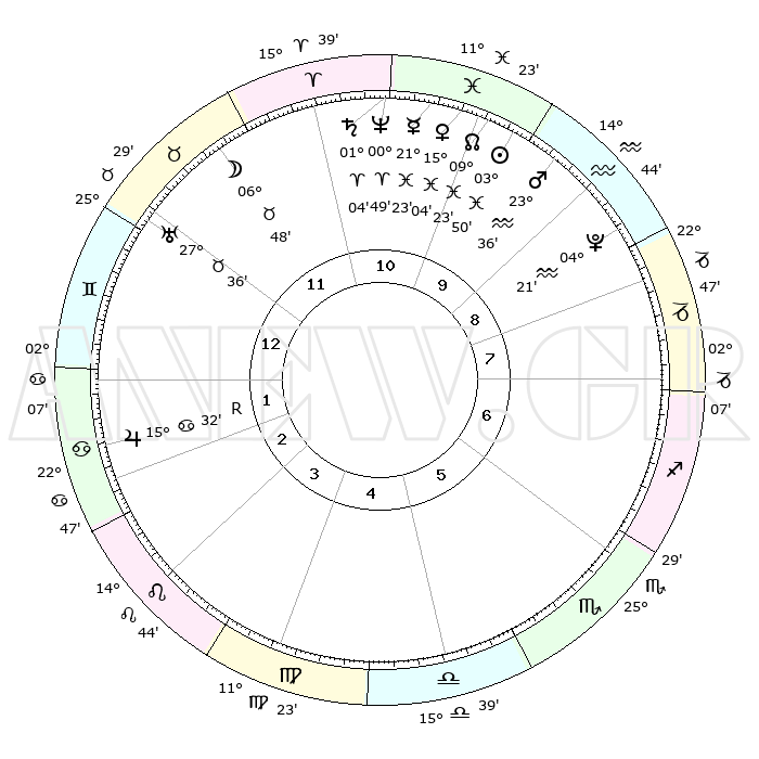 | | ΘΕΣΕΙΣ ΠΛΑΝΗΤΩΝ ΑΣΤΡΟΛΟΓΙΚΟΥ ΧΑΡΤΗ ΤΗΣ ΣΤΙΓΜΗΣ ΑΥΤΗΣ | | | | Πλανήτης | Ζώδιο | Μοίρες | Δεκαήμ. | Σε οίκο | Απόκλιση | | Ακμές των οίκων | | Ηλιος | Ιχθείς | 03°46' | Πρώτο | 10 | 10 S 08 | | 1ος | 05°51' | Δίδυμοι | | Σελήνη | Ταύρος | 05°46' | Πρώτο | 12 | 17 N 37 | | 2ος | 29°33' | Δίδυμοι | | Ερμής | Ιχθείς | 21°20' | Τρίτο | 11 | 01 S 43 | | 3ος | 20°48' | Καρκίνος | | Αφροδίτη | Ιχθείς | 14°59' | Δεύτερο | 11 | 07 S 14 | | 4ος | 14°03' | Λέων | | Αρης | Υδροχόος | 23°33' | Τρίτο | 10 | 14 S 42 | | 5ος | 13°33' | Παρθένος | | Δίας | Καρκίνος | 15°32'R | Δεύτερο | 2 | 22 N 52 | | 6ος | 22°49' | Ζυγός | | Κρόνος | Κριός | 01°04' | Πρώτο | 11 | 01 S 32 | | 7ος | 05°51' | Τοξότης | | Ουρανός | Ταύρος | 27°36' | Τρίτο | 12 | 19 N 27 | | 8ος | 29°33' | Τοξότης | | Ποσειδώνας | Κριός | 00°49' | Πρώτο | 11 | 00 S 53 | | 9ος | 20°48' | Αιγόκερως | | Πλούτωνας | Υδροχόος | 04°21' | Πρώτο | 9 | 22 S 54 | | 10ος | 14°03' | Υδροχόος | | Β. Δεσμός | Ιχθείς | 09°24' | Πρώτο | 10 | 08 S 03 | | 11ος | 13°33' | Ιχθείς | | Ωροσκόπος | Δίδυμοι | 05°51' | Πρώτο | | | 12ος | 22°49' | Κριός | | Μεσουράνημα | Υδροχόος | 14°03' | Δεύτερο | | | |