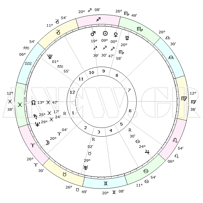 | | ΘΕΣΕΙΣ ΠΛΑΝΗΤΩΝ ΑΣΤΡΟΛΟΓΙΚΟΥ ΧΑΡΤΗ ΤΗΣ ΣΤΙΓΜΗΣ ΑΥΤΗΣ | | | | Πλανήτης | Ζώδιο | Μοίρες | Δεκαήμ. | Σε οίκο | Απόκλιση | | Ακμές των οίκων | | Ηλιος | Τοξότης | 09°28' | Πρώτο | 9 | 21 S 52 | | 1ος | 25°28' | Υδροχόος | | Σελήνη | Κριός | 19°37' | Δεύτερο | 2 | 10 N 22 | | 2ος | 11°09' | Κριός | | Ερμής | Σκορπιός | 20°57' | Τρίτο | 9 | 15 S 28 | | 3ος | 14°47' | Ταύρος | | Αφροδίτη | Τοξότης | 00°45' | Πρώτο | 9 | 19 S 38 | | 4ος | 09°39' | Δίδυμοι | | Αρης | Τοξότης | 19°37' | Δεύτερο | 10 | 23 S 42 | | 5ος | 01°22' | Καρκίνος | | Δίας | Καρκίνος | 24°30'R | Τρίτο | 6 | 21 N 22 | | 6ος | 24°29' | Καρκίνος | | Κρόνος | Ιχθείς | 25°17' | Τρίτο | 1 | 04 S 03 | | 7ος | 25°28' | Λέων | | Ουρανός | Ταύρος | 29°02'R | Τρίτο | 3 | 19 N 44 | | 8ος | 11°09' | Ζυγός | | Ποσειδώνας | Ιχθείς | 29°24'R | Τρίτο | 1 | 01 S 29 | | 9ος | 14°47' | Σκορπιός | | Πλούτωνας | Υδροχόος | 01°55' | Πρώτο | 12 | 23 S 24 | | 10ος | 09°39' | Τοξότης | | Β. Δεσμός | Ιχθείς | 13°47' | Δεύτερο | 1 | 06 S 22 | | 11ος | 01°22' | Αιγόκερως | | Ωροσκόπος | Υδροχόος | 25°28' | Τρίτο | | | 12ος | 24°29' | Αιγόκερως | | Μεσουράνημα | Τοξότης | 09°39' | Πρώτο | | | |