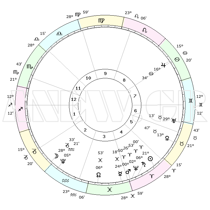 | | ΘΕΣΕΙΣ ΠΛΑΝΗΤΩΝ ΑΣΤΡΟΛΟΓΙΚΟΥ ΧΑΡΤΗ ΤΗΣ ΣΤΙΓΜΗΣ ΑΥΤΗΣ | | | | Πλανήτης | Ζώδιο | Μοίρες | Δεκαήμ. | Σε οίκο | Απόκλιση | | Ακμές των οίκων | | Ηλιος | Κριός | 20°56' | Τρίτο | 5 | 08 N 10 | | 1ος | 19°21' | Σκορπιός | | Σελήνη | Αιγόκερως | 27°36' | Τρίτο | 3 | 23 S 56 | | 2ος | 19°13' | Τοξότης | | Ερμής | Ιχθείς | 24°12' | Τρίτο | 4 | 04 S 30 | | 3ος | 23°17' | Αιγόκερως | | Αφροδίτη | Ταύρος | 13°41' | Δεύτερο | 6 | 15 N 56 | | 4ος | 28°51' | Υδροχόος | | Αρης | Κριός | 00°47' | Πρώτο | 4 | 00 S 37 | | 5ος | 00°58' | Κριός | | Δίας | Καρκίνος | 16°33' | Δεύτερο | 8 | 22 N 47 | | 6ος | 27°27' | Κριός | | Κρόνος | Κριός | 06°52' | Πρώτο | 5 | 00 N 46 | | 7ος | 19°21' | Ταύρος | | Ουρανός | Ταύρος | 29°13' | Τρίτο | 7 | 19 N 49 | | 8ος | 19°13' | Δίδυμοι | | Ποσειδώνας | Κριός | 02°34' | Πρώτο | 5 | 00 S 11 | | 9ος | 23°17' | Καρκίνος | | Πλούτωνας | Υδροχόος | 05°21' | Πρώτο | 3 | 22 S 47 | | 10ος | 28°51' | Λέων | | Β. Δεσμός | Ιχθείς | 06°53' | Πρώτο | 4 | 08 S 59 | | 11ος | 00°58' | Ζυγός | | Ωροσκόπος | Σκορπιός | 19°21' | Δεύτερο | | | 12ος | 27°27' | Ζυγός | | Μεσουράνημα | Λέων | 28°51' | Τρίτο | | | |