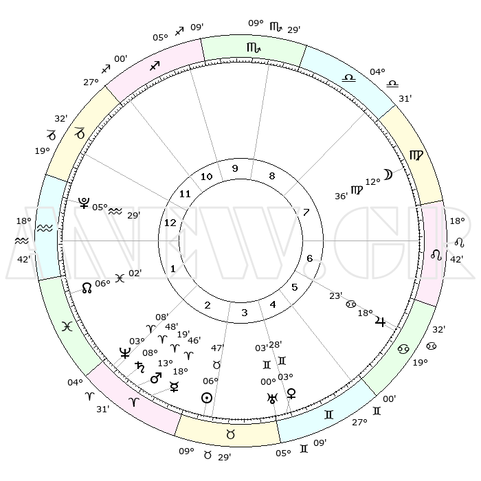 | | ΘΕΣΕΙΣ ΠΛΑΝΗΤΩΝ ΑΣΤΡΟΛΟΓΙΚΟΥ ΧΑΡΤΗ ΤΗΣ ΣΤΙΓΜΗΣ ΑΥΤΗΣ | | | | Πλανήτης | Ζώδιο | Μοίρες | Δεκαήμ. | Σε οίκο | Απόκλιση | | Ακμές των οίκων | | Ηλιος | Ταύρος | 06°43' | Πρώτο | 3 | 13 N 45 | | 1ος | 21°35' | Αιγόκερως | | Σελήνη | Παρθένος | 11°48' | Δεύτερο | 8 | 06 N 46 | | 2ος | 04°04' | Ιχθείς | | Ερμής | Κριός | 18°40' | Δεύτερο | 3 | 05 N 11 | | 3ος | 13°38' | Κριός | | Αφροδίτη | Δίδυμοι | 03°23' | Πρώτο | 4 | 21 N 32 | | 4ος | 13°37' | Ταύρος | | Αρης | Κριός | 13°17' | Δεύτερο | 2 | 04 N 24 | | 5ος | 07°06' | Δίδυμοι | | Δίας | Καρκίνος | 18°22' | Δεύτερο | 6 | 22 N 33 | | 6ος | 28°20' | Δίδυμοι | | Κρόνος | Κριός | 08°48' | Πρώτο | 2 | 01 N 30 | | 7ος | 21°35' | Καρκίνος | | Ουρανός | Δίδυμοι | 00°03' | Πρώτο | 4 | 20 N 00 | | 8ος | 04°04' | Παρθένος | | Ποσειδώνας | Κριός | 03°08' | Πρώτο | 2 | 00 N 02 | | 9ος | 13°38' | Ζυγός | | Πλούτωνας | Υδροχόος | 05°29' | Πρώτο | 1 | 22 S 48 | | 10ος | 13°37' | Σκορπιός | | Β. Δεσμός | Ιχθείς | 06°02' | Πρώτο | 2 | 09 S 18 | | 11ος | 07°06' | Τοξότης | | Ωροσκόπος | Αιγόκερως | 21°35' | Τρίτο | | | 12ος | 28°19' | Τοξότης | | Μεσουράνημα | Σκορπιός | 13°37' | Δεύτερο | | | |