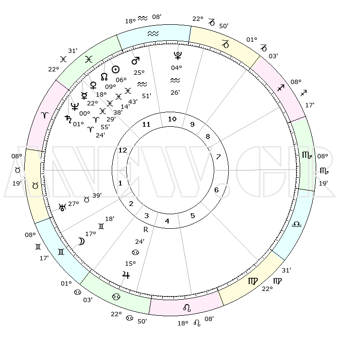 | | ΘΕΣΕΙΣ ΠΛΑΝΗΤΩΝ ΑΣΤΡΟΛΟΓΙΚΟΥ ΧΑΡΤΗ ΤΗΣ ΣΤΙΓΜΗΣ ΑΥΤΗΣ | | | | Πλανήτης | Ζώδιο | Μοίρες | Δεκαήμ. | Σε οίκο | Απόκλιση | | Ακμές των οίκων | | Ηλιος | Ιχθείς | 06°40' | Πρώτο | 12 | 09 S 04 | | 1ος | 08°19' | Κριός | | Σελήνη | Δίδυμοι | 16°32' | Δεύτερο | 3 | 27 N 58 | | 2ος | 16°30' | Ταύρος | | Ερμής | Ιχθείς | 22°29' | Τρίτο | 12 | 00 S 38 | | 3ος | 12°41' | Δίδυμοι | | Αφροδίτη | Ιχθείς | 18°34' | Δεύτερο | 12 | 05 S 49 | | 4ος | 04°41' | Καρκίνος | | Αρης | Υδροχόος | 25°49' | Τρίτο | 11 | 13 S 56 | | 5ος | 27°24' | Καρκίνος | | Δίας | Καρκίνος | 15°24'R | Δεύτερο | 4 | 22 N 53 | | 6ος | 26°08' | Λέων | | Κρόνος | Κριός | 01°24' | Πρώτο | 12 | 01 S 24 | | 7ος | 08°19' | Ζυγός | | Ουρανός | Ταύρος | 27°39' | Τρίτο | 2 | 19 N 27 | | 8ος | 16°30' | Σκορπιός | | Ποσειδώνας | Κριός | 00°55' | Πρώτο | 12 | 00 S 50 | | 9ος | 12°41' | Τοξότης | | Πλούτωνας | Υδροχόος | 04°26' | Πρώτο | 11 | 22 S 53 | | 10ος | 04°41' | Αιγόκερως | | Β. Δεσμός | Ιχθείς | 09°15' | Πρώτο | 12 | 08 S 06 | | 11ος | 27°24' | Αιγόκερως | | Ωροσκόπος | Κριός | 08°19' | Πρώτο | | | 12ος | 26°08' | Υδροχόος | | Μεσουράνημα | Αιγόκερως | 04°41' | Πρώτο | | | |