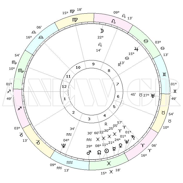 | | ΘΕΣΕΙΣ ΠΛΑΝΗΤΩΝ ΑΣΤΡΟΛΟΓΙΚΟΥ ΧΑΡΤΗ ΤΗΣ ΣΤΙΓΜΗΣ ΑΥΤΗΣ | | | | Πλανήτης | Ζώδιο | Μοίρες | Δεκαήμ. | Σε οίκο | Απόκλιση | | Ακμές των οίκων | | Ηλιος | Ιχθείς | 11°19' | Δεύτερο | 4 | 07 S 19 | | 1ος | 14°52' | Σκορπιός | | Σελήνη | Λέων | 21°26' | Τρίτο | 9 | 15 N 52 | | 2ος | 14°20' | Τοξότης | | Ερμής | Ιχθείς | 21°32'R | Τρίτο | 4 | 00 S 12 | | 3ος | 17°48' | Αιγόκερως | | Αφροδίτη | Ιχθείς | 24°20' | Τρίτο | 4 | 03 S 29 | | 4ος | 23°04' | Υδροχόος | | Αρης | Υδροχόος | 29°28' | Τρίτο | 4 | 12 S 41 | | 5ος | 25°30' | Ιχθείς | | Δίας | Καρκίνος | 15°13'R | Δεύτερο | 8 | 22 N 54 | | 6ος | 22°33' | Κριός | | Κρόνος | Κριός | 01°57' | Πρώτο | 5 | 01 S 11 | | 7ος | 14°52' | Ταύρος | | Ουρανός | Ταύρος | 27°45' | Τρίτο | 7 | 19 N 29 | | 8ος | 14°20' | Δίδυμοι | | Ποσειδώνας | Κριός | 01°05' | Πρώτο | 5 | 00 S 46 | | 9ος | 17°48' | Καρκίνος | | Πλούτωνας | Υδροχόος | 04°34' | Πρώτο | 3 | 22 S 52 | | 10ος | 23°04' | Λέων | | Β. Δεσμός | Ιχθείς | 08°60' | Πρώτο | 4 | 08 S 12 | | 11ος | 25°30' | Παρθένος | | Ωροσκόπος | Σκορπιός | 14°52' | Δεύτερο | | | 12ος | 22°33' | Ζυγός | | Μεσουράνημα | Λέων | 23°04' | Τρίτο | | | |
