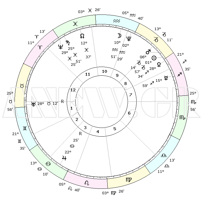 | | ΘΕΣΕΙΣ ΠΛΑΝΗΤΩΝ ΑΣΤΡΟΛΟΓΙΚΟΥ ΧΑΡΤΗ ΤΗΣ ΣΤΙΓΜΗΣ ΑΥΤΗΣ | | | | Πλανήτης | Ζώδιο | Μοίρες | Δεκαήμ. | Σε οίκο | Απόκλιση | | Ακμές των οίκων | | Ηλιος | Αιγόκερως | 01°52' | Πρώτο | 9 | 23 S 25 | | 1ος | 14°32' | Κριός | | Σελήνη | Υδροχόος | 09°51' | Πρώτο | 11 | 20 S 19 | | 2ος | 21°02' | Ταύρος | | Ερμής | Τοξότης | 15°52' | Δεύτερο | 8 | 22 S 14 | | 3ος | 16°24' | Δίδυμοι | | Αφροδίτη | Τοξότης | 28°28' | Τρίτο | 9 | 23 S 36 | | 4ος | 08°13' | Καρκίνος | | Αρης | Αιγόκερως | 06°10' | Πρώτο | 9 | 24 S 07 | | 5ος | 01°20' | Λέων | | Δίας | Καρκίνος | 22°26'R | Τρίτο | 4 | 21 N 47 | | 6ος | 01°08' | Παρθένος | | Κρόνος | Ιχθείς | 25°51' | Τρίτο | 12 | 03 S 45 | | 7ος | 14°32' | Ζυγός | | Ουρανός | Ταύρος | 28°12'R | Τρίτο | 2 | 19 N 34 | | 8ος | 21°02' | Σκορπιός | | Ποσειδώνας | Ιχθείς | 29°25' | Τρίτο | 12 | 01 S 27 | | 9ος | 16°24' | Τοξότης | | Πλούτωνας | Υδροχόος | 02°28' | Πρώτο | 11 | 23 S 16 | | 10ος | 08°13' | Αιγόκερως | | Β. Δεσμός | Ιχθείς | 12°37' | Δεύτερο | 12 | 06 S 49 | | 11ος | 01°20' | Υδροχόος | | Ωροσκόπος | Κριός | 14°32' | Δεύτερο | | | 12ος | 01°08' | Ιχθείς | | Μεσουράνημα | Αιγόκερως | 08°13' | Πρώτο | | | |