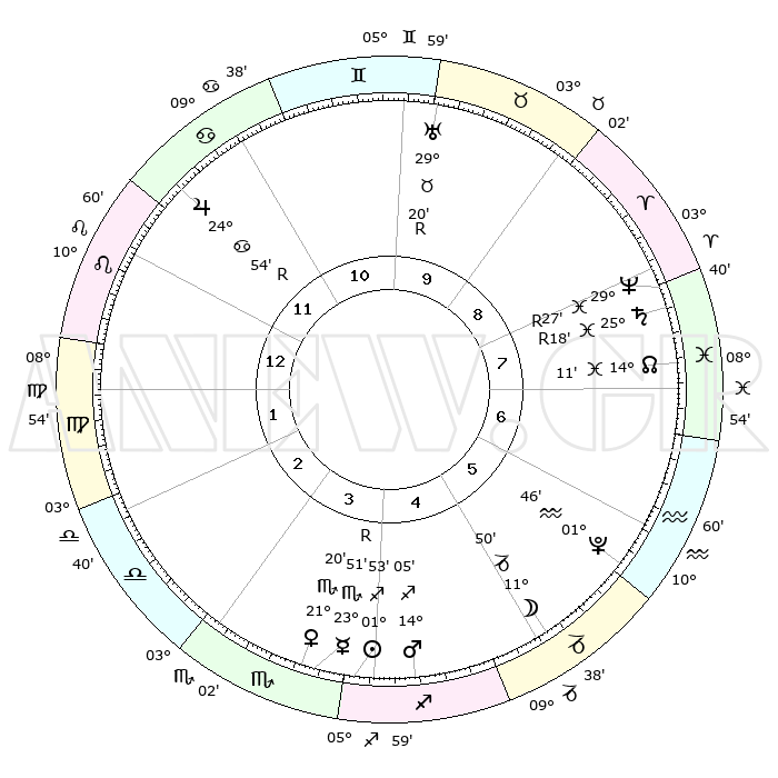 | | ΘΕΣΕΙΣ ΠΛΑΝΗΤΩΝ ΑΣΤΡΟΛΟΓΙΚΟΥ ΧΑΡΤΗ ΤΗΣ ΣΤΙΓΜΗΣ ΑΥΤΗΣ | | | | Πλανήτης | Ζώδιο | Μοίρες | Δεκαήμ. | Σε οίκο | Απόκλιση | | Ακμές των οίκων | | Ηλιος | Τοξότης | 01°52' | Πρώτο | 4 | 20 S 32 | | 1ος | 03°49' | Παρθένος | | Σελήνη | Αιγόκερως | 11°37' | Δεύτερο | 5 | 27 S 22 | | 2ος | 28°04' | Παρθένος | | Ερμής | Σκορπιός | 23°53'R | Τρίτο | 3 | 17 S 10 | | 3ος | 27°04' | Ζυγός | | Αφροδίτη | Σκορπιός | 21°19' | Τρίτο | 3 | 17 S 10 | | 4ος | 00°01' | Τοξότης | | Αρης | Τοξότης | 14°04' | Δεύτερο | 4 | 23 S 05 | | 5ος | 03°58' | Αιγόκερως | | Δίας | Καρκίνος | 24°54'R | Τρίτο | 11 | 21 N 17 | | 6ος | 05°38' | Υδροχόος | | Κρόνος | Ιχθείς | 25°18'R | Τρίτο | 7 | 04 S 04 | | 7ος | 03°49' | Ιχθείς | | Ουρανός | Ταύρος | 29°20'R | Τρίτο | 9 | 19 N 48 | | 8ος | 28°04' | Ιχθείς | | Ποσειδώνας | Ιχθείς | 29°27'R | Τρίτο | 8 | 01 S 28 | | 9ος | 27°04' | Κριός | | Πλούτωνας | Υδροχόος | 01°46' | Πρώτο | 5 | 23 S 26 | | 10ος | 00°01' | Δίδυμοι | | Β. Δεσμός | Ιχθείς | 14°11' | Δεύτερο | 7 | 06 S 13 | | 11ος | 03°58' | Καρκίνος | | Ωροσκόπος | Παρθένος | 03°49' | Πρώτο | | | 12ος | 05°38' | Λέων | | Μεσουράνημα | Δίδυμοι | 00°01' | Πρώτο | | | |