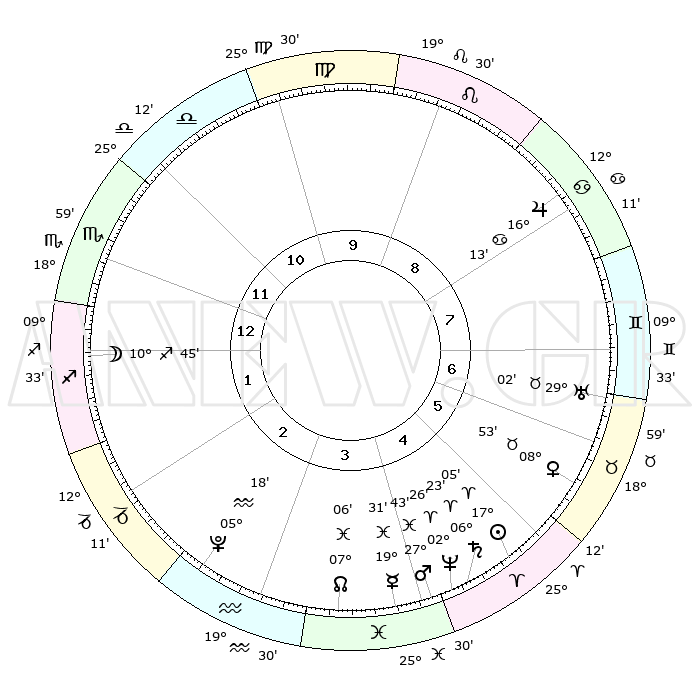 | | ΘΕΣΕΙΣ ΠΛΑΝΗΤΩΝ ΑΣΤΡΟΛΟΓΙΚΟΥ ΧΑΡΤΗ ΤΗΣ ΣΤΙΓΜΗΣ ΑΥΤΗΣ | | | | Πλανήτης | Ζώδιο | Μοίρες | Δεκαήμ. | Σε οίκο | Απόκλιση | | Ακμές των οίκων | | Ηλιος | Κριός | 17°01' | Δεύτερο | 5 | 06 N 41 | | 1ος | 21°25' | Σκορπιός | | Σελήνη | Τοξότης | 10°01' | Δεύτερο | 1 | 27 S 03 | | 2ος | 21°30' | Τοξότης | | Ερμής | Ιχθείς | 19°27' | Δεύτερο | 4 | 06 S 04 | | 3ος | 25°52' | Αιγόκερως | | Αφροδίτη | Ταύρος | 08°48' | Πρώτο | 6 | 14 N 15 | | 4ος | 01°33' | Ιχθείς | | Αρης | Ιχθείς | 27°40' | Τρίτο | 4 | 01 S 52 | | 5ος | 03°30' | Κριός | | Δίας | Καρκίνος | 16°13' | Δεύτερο | 8 | 22 N 49 | | 6ος | 29°42' | Κριός | | Κρόνος | Κριός | 06°23' | Πρώτο | 5 | 00 N 34 | | 7ος | 21°25' | Ταύρος | | Ουρανός | Ταύρος | 29°02' | Τρίτο | 7 | 19 N 46 | | 8ος | 21°30' | Δίδυμοι | | Ποσειδώνας | Κριός | 02°26' | Πρώτο | 4 | 00 S 14 | | 9ος | 25°52' | Καρκίνος | | Πλούτωνας | Υδροχόος | 05°18' | Πρώτο | 3 | 22 S 47 | | 10ος | 01°33' | Παρθένος | | Β. Δεσμός | Ιχθείς | 07°06' | Πρώτο | 4 | 08 S 54 | | 11ος | 03°30' | Ζυγός | | Ωροσκόπος | Σκορπιός | 21°25' | Τρίτο | | | 12ος | 29°42' | Ζυγός | | Μεσουράνημα | Παρθένος | 01°33' | Πρώτο | | | |