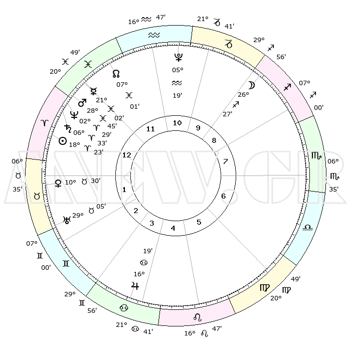 | | ΘΕΣΕΙΣ ΠΛΑΝΗΤΩΝ ΑΣΤΡΟΛΟΓΙΚΟΥ ΧΑΡΤΗ ΤΗΣ ΣΤΙΓΜΗΣ ΑΥΤΗΣ | | | | Πλανήτης | Ζώδιο | Μοίρες | Δεκαήμ. | Σε οίκο | Απόκλιση | | Ακμές των οίκων | | Ηλιος | Κριός | 18°20' | Δεύτερο | 1 | 07 N 11 | | 1ος | 05°31' | Κριός | | Σελήνη | Τοξότης | 25°48' | Τρίτο | 9 | 28 S 17 | | 2ος | 14°26' | Ταύρος | | Ερμής | Ιχθείς | 20°58' | Τρίτο | 12 | 05 S 35 | | 3ος | 11°01' | Δίδυμοι | | Αφροδίτη | Ταύρος | 10°26' | Δεύτερο | 1 | 14 N 49 | | 4ος | 03°06' | Καρκίνος | | Αρης | Ιχθείς | 28°43' | Τρίτο | 12 | 01 S 27 | | 5ος | 25°40' | Καρκίνος | | Δίας | Καρκίνος | 16°19' | Δεύτερο | 4 | 22 N 49 | | 6ος | 23°57' | Λέων | | Κρόνος | Κριός | 06°33' | Πρώτο | 1 | 00 N 38 | | 7ος | 05°31' | Ζυγός | | Ουρανός | Ταύρος | 29°05' | Τρίτο | 2 | 19 N 47 | | 8ος | 14°26' | Σκορπιός | | Ποσειδώνας | Κριός | 02°29' | Πρώτο | 12 | 00 S 13 | | 9ος | 11°01' | Τοξότης | | Πλούτωνας | Υδροχόος | 05°19' | Πρώτο | 11 | 22 S 47 | | 10ος | 03°06' | Αιγόκερως | | Β. Δεσμός | Ιχθείς | 07°01' | Πρώτο | 12 | 08 S 56 | | 11ος | 25°40' | Αιγόκερως | | Ωροσκόπος | Κριός | 05°31' | Πρώτο | | | 12ος | 23°57' | Υδροχόος | | Μεσουράνημα | Αιγόκερως | 03°06' | Πρώτο | | | |