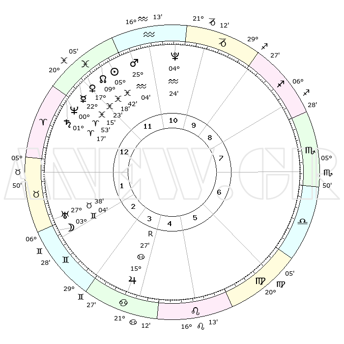 | | ΘΕΣΕΙΣ ΠΛΑΝΗΤΩΝ ΑΣΤΡΟΛΟΓΙΚΟΥ ΧΑΡΤΗ ΤΗΣ ΣΤΙΓΜΗΣ ΑΥΤΗΣ | | | | Πλανήτης | Ζώδιο | Μοίρες | Δεκαήμ. | Σε οίκο | Απόκλιση | | Ακμές των οίκων | | Ηλιος | Ιχθείς | 05°39' | Πρώτο | 12 | 09 S 26 | | 1ος | 02°13' | Κριός | | Σελήνη | Δίδυμοι | 02°13' | Πρώτο | 2 | 25 N 44 | | 2ος | 11°58' | Ταύρος | | Ερμής | Ιχθείς | 22°14' | Τρίτο | 12 | 00 S 57 | | 3ος | 09°02' | Δίδυμοι | | Αφροδίτη | Ιχθείς | 17°19' | Δεύτερο | 12 | 06 S 19 | | 4ος | 01°14' | Καρκίνος | | Αρης | Υδροχόος | 25°01' | Τρίτο | 12 | 14 S 12 | | 5ος | 23°39' | Καρκίνος | | Δίας | Καρκίνος | 15°27'R | Δεύτερο | 4 | 22 N 53 | | 6ος | 21°24' | Λέων | | Κρόνος | Κριός | 01°17' | Πρώτο | 12 | 01 S 27 | | 7ος | 02°13' | Ζυγός | | Ουρανός | Ταύρος | 27°38' | Τρίτο | 2 | 19 N 27 | | 8ος | 11°58' | Σκορπιός | | Ποσειδώνας | Κριός | 00°53' | Πρώτο | 12 | 00 S 51 | | 9ος | 09°02' | Τοξότης | | Πλούτωνας | Υδροχόος | 04°24' | Πρώτο | 11 | 22 S 54 | | 10ος | 01°14' | Αιγόκερως | | Β. Δεσμός | Ιχθείς | 09°18' | Πρώτο | 12 | 08 S 05 | | 11ος | 23°39' | Αιγόκερως | | Ωροσκόπος | Κριός | 02°13' | Πρώτο | | | 12ος | 21°24' | Υδροχόος | | Μεσουράνημα | Αιγόκερως | 01°14' | Πρώτο | | | |