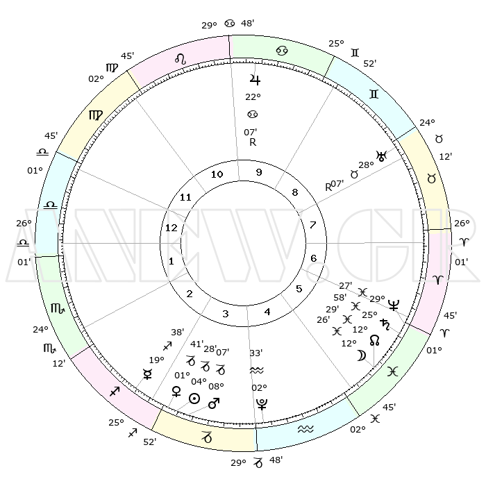 | | ΘΕΣΕΙΣ ΠΛΑΝΗΤΩΝ ΑΣΤΡΟΛΟΓΙΚΟΥ ΧΑΡΤΗ ΤΗΣ ΣΤΙΓΜΗΣ ΑΥΤΗΣ | | | | Πλανήτης | Ζώδιο | Μοίρες | Δεκαήμ. | Σε οίκο | Απόκλιση | | Ακμές των οίκων | | Ηλιος | Αιγόκερως | 04°23' | Πρώτο | 4 | 23 S 22 | | 1ος | 02°22' | Ζυγός | | Σελήνη | Ιχθείς | 11°23' | Δεύτερο | 6 | 07 S 17 | | 2ος | 29°07' | Ζυγός | | Ερμής | Τοξότης | 19°31' | Δεύτερο | 3 | 22 S 53 | | 3ος | 29°38' | Σκορπιός | | Αφροδίτη | Αιγόκερως | 01°35' | Πρώτο | 3 | 23 S 42 | | 4ος | 02°39' | Αιγόκερως | | Αρης | Αιγόκερως | 08°04' | Πρώτο | 4 | 24 S 02 | | 5ος | 05°36' | Υδροχόος | | Δίας | Καρκίνος | 22°08'R | Τρίτο | 10 | 21 N 50 | | 6ος | 05°57' | Ιχθείς | | Κρόνος | Ιχθείς | 25°58' | Τρίτο | 6 | 03 S 42 | | 7ος | 02°22' | Κριός | | Ουρανός | Ταύρος | 28°07'R | Τρίτο | 8 | 19 N 33 | | 8ος | 29°07' | Κριός | | Ποσειδώνας | Ιχθείς | 29°27' | Τρίτο | 6 | 01 S 27 | | 9ος | 29°38' | Ταύρος | | Πλούτωνας | Υδροχόος | 02°33' | Πρώτο | 4 | 23 S 15 | | 10ος | 02°39' | Καρκίνος | | Β. Δεσμός | Ιχθείς | 12°29' | Δεύτερο | 6 | 06 S 52 | | 11ος | 05°36' | Λέων | | Ωροσκόπος | Ζυγός | 02°22' | Πρώτο | | | 12ος | 05°57' | Παρθένος | | Μεσουράνημα | Καρκίνος | 02°39' | Πρώτο | | | |