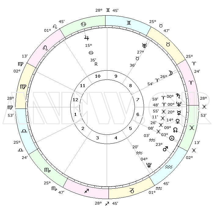 | | ΘΕΣΕΙΣ ΠΛΑΝΗΤΩΝ ΑΣΤΡΟΛΟΓΙΚΟΥ ΧΑΡΤΗ ΤΗΣ ΣΤΙΓΜΗΣ ΑΥΤΗΣ | | | | Πλανήτης | Ζώδιο | Μοίρες | Δεκαήμ. | Σε οίκο | Απόκλιση | | Ακμές των οίκων | | Ηλιος | Ιχθείς | 03°03' | Πρώτο | 6 | 10 S 23 | | 1ος | 05°49' | Παρθένος | | Σελήνη | Κριός | 25°48' | Τρίτο | 8 | 13 N 34 | | 2ος | 00°17' | Ζυγός | | Ερμής | Ιχθείς | 20°51' | Τρίτο | 7 | 02 S 05 | | 3ος | 29°26' | Ζυγός | | Αφροδίτη | Ιχθείς | 14°05' | Δεύτερο | 7 | 07 S 35 | | 4ος | 02°23' | Τοξότης | | Αρης | Υδροχόος | 22°59' | Τρίτο | 6 | 14 S 53 | | 5ος | 06°12' | Αιγόκερως | | Δίας | Καρκίνος | 15°35'R | Δεύτερο | 11 | 22 N 51 | | 6ος | 07°45' | Υδροχόος | | Κρόνος | Κριός | 00°59' | Πρώτο | 8 | 01 S 34 | | 7ος | 05°49' | Ιχθείς | | Ουρανός | Ταύρος | 27°36' | Τρίτο | 9 | 19 N 26 | | 8ος | 00°17' | Κριός | | Ποσειδώνας | Κριός | 00°47' | Πρώτο | 8 | 00 S 53 | | 9ος | 29°26' | Κριός | | Πλούτωνας | Υδροχόος | 04°20' | Πρώτο | 5 | 22 S 54 | | 10ος | 02°23' | Δίδυμοι | | Β. Δεσμός | Ιχθείς | 09°26' | Πρώτο | 7 | 08 S 02 | | 11ος | 06°12' | Καρκίνος | | Ωροσκόπος | Παρθένος | 05°49' | Πρώτο | | | 12ος | 07°45' | Λέων | | Μεσουράνημα | Δίδυμοι | 02°23' | Πρώτο | | | |
