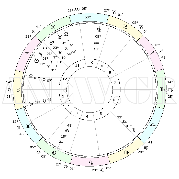 | | ΘΕΣΕΙΣ ΠΛΑΝΗΤΩΝ ΑΣΤΡΟΛΟΓΙΚΟΥ ΧΑΡΤΗ ΤΗΣ ΣΤΙΓΜΗΣ ΑΥΤΗΣ | | | | Πλανήτης | Ζώδιο | Μοίρες | Δεκαήμ. | Σε οίκο | Απόκλιση | | Ακμές των οίκων | | Ηλιος | Κριός | 11°27' | Δεύτερο | 1 | 04 N 32 | | 1ος | 11°24' | Κριός | | Σελήνη | Ζυγός | 00°45' | Πρώτο | 6 | 02 S 05 | | 2ος | 18°46' | Ταύρος | | Ερμής | Ιχθείς | 13°51' | Δεύτερο | 12 | 07 S 35 | | 3ος | 14°32' | Δίδυμοι | | Αφροδίτη | Ταύρος | 01°52' | Πρώτο | 1 | 11 N 43 | | 4ος | 06°26' | Καρκίνος | | Αρης | Ιχθείς | 23°16' | Τρίτο | 12 | 03 S 38 | | 5ος | 29°21' | Καρκίνος | | Δίας | Καρκίνος | 15°48' | Δεύτερο | 4 | 22 N 52 | | 6ος | 28°36' | Λέων | | Κρόνος | Κριός | 05°41' | Πρώτο | 12 | 00 N 18 | | 7ος | 11°24' | Ζυγός | | Ουρανός | Ταύρος | 28°46' | Τρίτο | 2 | 19 N 43 | | 8ος | 18°46' | Σκορπιός | | Ποσειδώνας | Κριός | 02°13' | Πρώτο | 12 | 00 S 19 | | 9ος | 14°32' | Τοξότης | | Πλούτωνας | Υδροχόος | 05°13' | Πρώτο | 11 | 22 S 47 | | 10ος | 06°26' | Αιγόκερως | | Β. Δεσμός | Ιχθείς | 07°24' | Πρώτο | 12 | 08 S 48 | | 11ος | 29°21' | Αιγόκερως | | Ωροσκόπος | Κριός | 11°24' | Δεύτερο | | | 12ος | 28°36' | Υδροχόος | | Μεσουράνημα | Αιγόκερως | 06°26' | Πρώτο | | | |