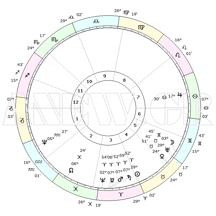 | | ΘΕΣΕΙΣ ΠΛΑΝΗΤΩΝ ΑΣΤΡΟΛΟΓΙΚΟΥ ΧΑΡΤΗ ΤΗΣ ΣΤΙΓΜΗΣ ΑΥΤΗΣ | | | | Πλανήτης | Ζώδιο | Μοίρες | Δεκαήμ. | Σε οίκο | Απόκλιση | | Ακμές των οίκων | | Ηλιος | Κριός | 29°49' | Τρίτο | 4 | 11 N 24 | | 1ος | 18°52' | Τοξότης | | Σελήνη | Δίδυμοι | 02°56' | Πρώτο | 6 | 25 N 43 | | 2ος | 23°23' | Αιγόκερως | | Ερμής | Κριός | 07°00' | Πρώτο | 3 | 00 N 22 | | 3ος | 02°10' | Ιχθείς | | Αφροδίτη | Ταύρος | 24°47' | Τρίτο | 5 | 19 N 21 | | 4ος | 07°33' | Κριός | | Αρης | Κριός | 07°49' | Πρώτο | 4 | 02 N 13 | | 5ος | 05°43' | Ταύρος | | Δίας | Καρκίνος | 17°30' | Δεύτερο | 7 | 22 N 40 | | 6ος | 28°27' | Ταύρος | | Κρόνος | Κριός | 07°58' | Πρώτο | 4 | 01 N 11 | | 7ος | 18°52' | Δίδυμοι | | Ουρανός | Ταύρος | 29°40' | Τρίτο | 6 | 19 N 55 | | 8ος | 23°23' | Καρκίνος | | Ποσειδώνας | Κριός | 02°54' | Πρώτο | 3 | 00 S 03 | | 9ος | 02°10' | Παρθένος | | Πλούτωνας | Υδροχόος | 05°27' | Πρώτο | 2 | 22 S 48 | | 10ος | 07°33' | Ζυγός | | Β. Δεσμός | Ιχθείς | 06°24' | Πρώτο | 3 | 09 S 10 | | 11ος | 05°43' | Σκορπιός | | Ωροσκόπος | Τοξότης | 18°52' | Δεύτερο | | | 12ος | 28°27' | Σκορπιός | | Μεσουράνημα | Ζυγός | 07°33' | Πρώτο | | | |