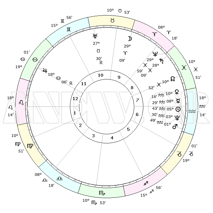 | | ΘΕΣΕΙΣ ΠΛΑΝΗΤΩΝ ΑΣΤΡΟΛΟΓΙΚΟΥ ΧΑΡΤΗ ΤΗΣ ΣΤΙΓΜΗΣ ΑΥΤΗΣ | | | | Πλανήτης | Ζώδιο | Μοίρες | Δεκαήμ. | Σε οίκο | Απόκλιση | | Ακμές των οίκων | | Ηλιος | Υδροχόος | 05°39' | Πρώτο | 7 | 18 S 51 | | 1ος | 29°54' | Καρκίνος | | Σελήνη | Κριός | 28°17' | Τρίτο | 10 | 14 N 31 | | 2ος | 20°55' | Λέων | | Ερμής | Υδροχόος | 08°23' | Πρώτο | 7 | 20 S 11 | | 3ος | 15°57' | Παρθένος | | Αφροδίτη | Υδροχόος | 10°12' | Δεύτερο | 7 | 18 S 53 | | 4ος | 16°59' | Ζυγός | | Αρης | Υδροχόος | 01°46' | Πρώτο | 7 | 20 S 45 | | 5ος | 23°02' | Σκορπιός | | Δίας | Καρκίνος | 18°06'R | Δεύτερο | 12 | 22 N 30 | | 6ος | 28°45' | Τοξότης | | Κρόνος | Ιχθείς | 28°09' | Τρίτο | 9 | 02 S 45 | | 7ος | 29°54' | Αιγόκερως | | Ουρανός | Ταύρος | 27°30'R | Τρίτο | 11 | 19 N 25 | | 8ος | 20°55' | Υδροχόος | | Ποσειδώνας | Ιχθείς | 29°59' | Τρίτο | 9 | 01 S 13 | | 9ος | 15°57' | Ιχθείς | | Πλούτωνας | Υδροχόος | 03°30' | Πρώτο | 7 | 23 S 04 | | 10ος | 16°59' | Κριός | | Β. Δεσμός | Ιχθείς | 10°52' | Δεύτερο | 8 | 07 S 29 | | 11ος | 23°02' | Ταύρος | | Ωροσκόπος | Καρκίνος | 29°54' | Τρίτο | | | 12ος | 28°45' | Δίδυμοι | | Μεσουράνημα | Κριός | 16°59' | Δεύτερο | | | |
