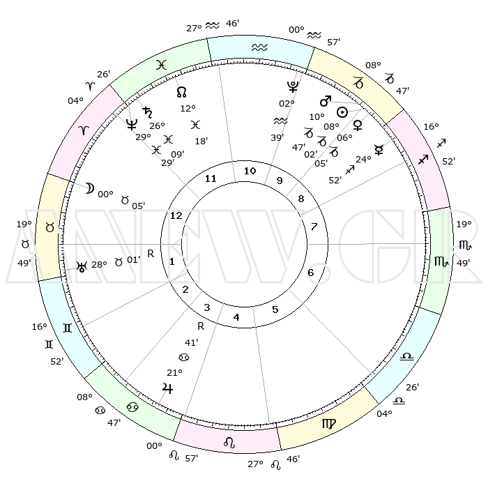 | | ΘΕΣΕΙΣ ΠΛΑΝΗΤΩΝ ΑΣΤΡΟΛΟΓΙΚΟΥ ΧΑΡΤΗ ΤΗΣ ΣΤΙΓΜΗΣ ΑΥΤΗΣ | | | | Πλανήτης | Ζώδιο | Μοίρες | Δεκαήμ. | Σε οίκο | Απόκλιση | | Ακμές των οίκων | | Ηλιος | Αιγόκερως | 07°57' | Πρώτο | 10 | 23 S 12 | | 1ος | 10°44' | Κριός | | Σελήνη | Κριός | 29°01' | Τρίτο | 1 | 14 N 38 | | 2ος | 18°16' | Ταύρος | | Ερμής | Τοξότης | 24°46' | Τρίτο | 9 | 23 S 36 | | 3ος | 14°08' | Δίδυμοι | | Αφροδίτη | Αιγόκερως | 05°59' | Πρώτο | 9 | 23 S 42 | | 4ος | 06°03' | Καρκίνος | | Αρης | Αιγόκερως | 10°44' | Δεύτερο | 10 | 23 S 52 | | 5ος | 28°55' | Καρκίνος | | Δίας | Καρκίνος | 21°41'R | Τρίτο | 4 | 21 N 55 | | 6ος | 28°04' | Λέων | | Κρόνος | Ιχθείς | 26°09' | Τρίτο | 12 | 03 S 37 | | 7ος | 10°44' | Ζυγός | | Ουρανός | Ταύρος | 28°01'R | Τρίτο | 2 | 19 N 31 | | 8ος | 18°17' | Σκορπιός | | Ποσειδώνας | Ιχθείς | 29°29' | Τρίτο | 12 | 01 S 26 | | 9ος | 14°08' | Τοξότης | | Πλούτωνας | Υδροχόος | 02°39' | Πρώτο | 11 | 23 S 14 | | 10ος | 06°03' | Αιγόκερως | | Β. Δεσμός | Ιχθείς | 12°18' | Δεύτερο | 12 | 06 S 57 | | 11ος | 28°55' | Αιγόκερως | | Ωροσκόπος | Κριός | 10°44' | Δεύτερο | | | 12ος | 28°04' | Υδροχόος | | Μεσουράνημα | Αιγόκερως | 06°03' | Πρώτο | | | |