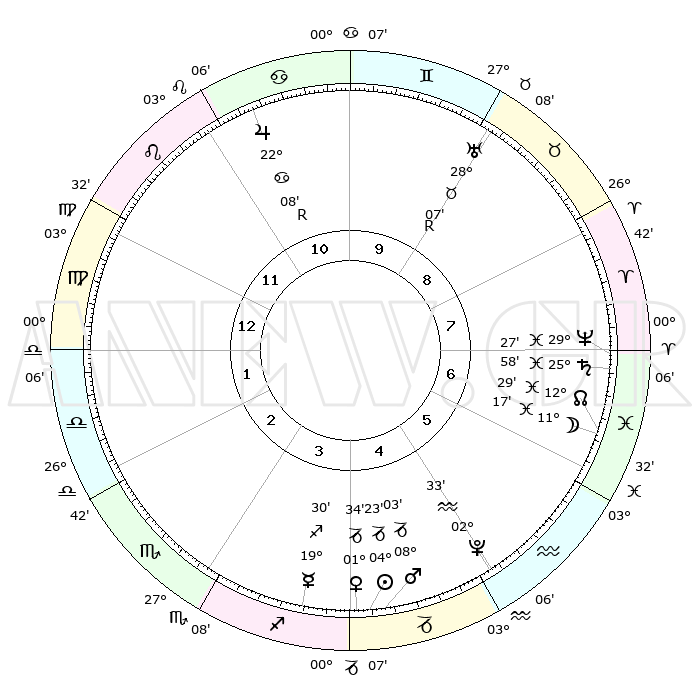| | ΘΕΣΕΙΣ ΠΛΑΝΗΤΩΝ ΑΣΤΡΟΛΟΓΙΚΟΥ ΧΑΡΤΗ ΤΗΣ ΣΤΙΓΜΗΣ ΑΥΤΗΣ | | | | Πλανήτης | Ζώδιο | Μοίρες | Δεκαήμ. | Σε οίκο | Απόκλιση | | Ακμές των οίκων | | Ηλιος | Αιγόκερως | 04°18' | Πρώτο | 4 | 23 S 22 | | 1ος | 06°13' | Παρθένος | | Σελήνη | Ιχθείς | 10°14' | Δεύτερο | 7 | 07 S 49 | | 2ος | 00°43' | Ζυγός | | Ερμής | Τοξότης | 19°23' | Δεύτερο | 4 | 22 S 51 | | 3ος | 29°54' | Ζυγός | | Αφροδίτη | Αιγόκερως | 01°28' | Πρώτο | 4 | 23 S 42 | | 4ος | 02°51' | Τοξότης | | Αρης | Αιγόκερως | 07°59' | Πρώτο | 5 | 24 S 02 | | 5ος | 06°39' | Αιγόκερως | | Δίας | Καρκίνος | 22°08'R | Τρίτο | 11 | 21 N 50 | | 6ος | 08°10' | Υδροχόος | | Κρόνος | Ιχθείς | 25°57' | Τρίτο | 7 | 03 S 42 | | 7ος | 06°13' | Ιχθείς | | Ουρανός | Ταύρος | 28°08'R | Τρίτο | 9 | 19 N 33 | | 8ος | 00°43' | Κριός | | Ποσειδώνας | Ιχθείς | 29°27' | Τρίτο | 7 | 01 S 27 | | 9ος | 29°54' | Κριός | | Πλούτωνας | Υδροχόος | 02°32' | Πρώτο | 5 | 23 S 15 | | 10ος | 02°51' | Δίδυμοι | | Β. Δεσμός | Ιχθείς | 12°30' | Δεύτερο | 7 | 06 S 52 | | 11ος | 06°39' | Καρκίνος | | Ωροσκόπος | Παρθένος | 06°13' | Πρώτο | | | 12ος | 08°10' | Λέων | | Μεσουράνημα | Δίδυμοι | 02°51' | Πρώτο | | | |