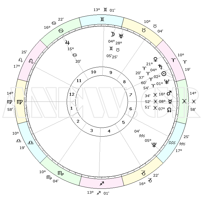 | | ΘΕΣΕΙΣ ΠΛΑΝΗΤΩΝ ΑΣΤΡΟΛΟΓΙΚΟΥ ΧΑΡΤΗ ΤΗΣ ΣΤΙΓΜΗΣ ΑΥΤΗΣ | | | | Πλανήτης | Ζώδιο | Μοίρες | Δεκαήμ. | Σε οίκο | Απόκλιση | | Ακμές των οίκων | | Ηλιος | Κριός | 02°56' | Πρώτο | 8 | 01 N 10 | | 1ος | 24°54' | Λέων | | Σελήνη | Δίδυμοι | 03°06' | Πρώτο | 10 | 25 N 53 | | 2ος | 18°13' | Παρθένος | | Ερμής | Ιχθείς | 08°51' | Πρώτο | 7 | 07 S 56 | | 3ος | 16°23' | Ζυγός | | Αφροδίτη | Κριός | 21°14' | Τρίτο | 9 | 07 N 34 | | 4ος | 19°13' | Σκορπιός | | Αρης | Ιχθείς | 16°31' | Δεύτερο | 7 | 06 S 18 | | 5ος | 23°46' | Τοξότης | | Δίας | Καρκίνος | 15°20' | Δεύτερο | 11 | 22 N 55 | | 6ος | 26°10' | Αιγόκερως | | Κρόνος | Κριός | 04°37' | Πρώτο | 8 | 00 S 07 | | 7ος | 24°54' | Υδροχόος | | Ουρανός | Ταύρος | 28°25' | Τρίτο | 10 | 19 N 38 | | 8ος | 18°13' | Ιχθείς | | Ποσειδώνας | Κριός | 01°53' | Πρώτο | 8 | 00 S 27 | | 9ος | 16°23' | Κριός | | Πλούτωνας | Υδροχόος | 05°04' | Πρώτο | 6 | 22 S 48 | | 10ος | 19°13' | Ταύρος | | Β. Δεσμός | Ιχθείς | 07°51' | Πρώτο | 7 | 08 S 37 | | 11ος | 23°46' | Δίδυμοι | | Ωροσκόπος | Λέων | 24°54' | Τρίτο | | | 12ος | 26°10' | Καρκίνος | | Μεσουράνημα | Ταύρος | 19°13' | Δεύτερο | | | |