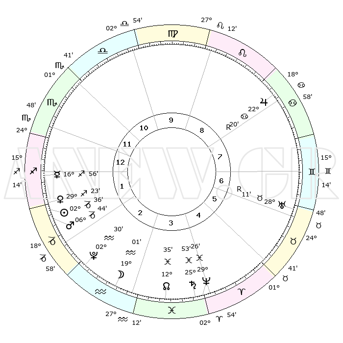 | | ΘΕΣΕΙΣ ΠΛΑΝΗΤΩΝ ΑΣΤΡΟΛΟΓΙΚΟΥ ΧΑΡΤΗ ΤΗΣ ΣΤΙΓΜΗΣ ΑΥΤΗΣ | | | | Πλανήτης | Ζώδιο | Μοίρες | Δεκαήμ. | Σε οίκο | Απόκλιση | | Ακμές των οίκων | | Ηλιος | Αιγόκερως | 02°32' | Πρώτο | 2 | 23 S 24 | | 1ος | 22°38' | Σκορπιός | | Σελήνη | Υδροχόος | 18°03' | Δεύτερο | 3 | 17 S 19 | | 2ος | 22°52' | Τοξότης | | Ερμής | Τοξότης | 16°49' | Δεύτερο | 1 | 22 S 25 | | 3ος | 27°24' | Αιγόκερως | | Αφροδίτη | Τοξότης | 29°17' | Τρίτο | 2 | 23 S 38 | | 4ος | 03°09' | Ιχθείς | | Αρης | Αιγόκερως | 06°40' | Πρώτο | 2 | 24 S 06 | | 5ος | 04°60' | Κριός | | Δίας | Καρκίνος | 22°21'R | Τρίτο | 8 | 21 N 48 | | 6ος | 01°02' | Ταύρος | | Κρόνος | Ιχθείς | 25°53' | Τρίτο | 4 | 03 S 44 | | 7ος | 22°38' | Ταύρος | | Ουρανός | Ταύρος | 28°11'R | Τρίτο | 7 | 19 N 33 | | 8ος | 22°52' | Δίδυμοι | | Ποσειδώνας | Ιχθείς | 29°26' | Τρίτο | 4 | 01 S 27 | | 9ος | 27°24' | Καρκίνος | | Πλούτωνας | Υδροχόος | 02°29' | Πρώτο | 3 | 23 S 16 | | 10ος | 03°09' | Παρθένος | | Β. Δεσμός | Ιχθείς | 12°35' | Δεύτερο | 4 | 06 S 50 | | 11ος | 04°60' | Ζυγός | | Ωροσκόπος | Σκορπιός | 22°38' | Τρίτο | | | 12ος | 01°02' | Σκορπιός | | Μεσουράνημα | Παρθένος | 03°09' | Πρώτο | | | |