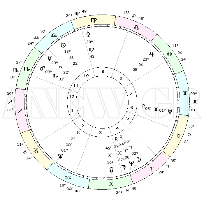 | ΘΕΣΕΙΣ ΠΛΑΝΗΤΩΝ ΑΣΤΡΟΛΟΓΙΚΟΥ ΧΑΡΤΗ ΤΗΣ ΣΤΙΓΜΗΣ ΑΥΤΗΣ | | Πλανήτης | Ζώδιο | Μοίρες | Δεκαήμ. | Σε οίκο | Απόκλιση | | Ακμές των οίκων | Ηλιος | Ζυγός | 13°17' | Δεύτερο | 11 | 05 S 15 | | 1ος | 13°40' | Σκορπιός | Σελήνη | Κριός | 01°19' | Πρώτο | 5 | 01 N 37 | | 2ος | 13°02' | Τοξότης | Ερμής | Ζυγός | 29°24' | Τρίτο | 12 | 11 S 57 | | 3ος | 16°21' | Αιγόκερως | Αφροδίτη | Παρθένος | 20°36' | Τρίτο | 10 | 05 N 00 | | 4ος | 21°32' | Υδροχόος | Αρης | Σκορπιός | 09°29' | Πρώτο | 12 | 14 S 47 | | 5ος | 24°02' | Ιχθείς | Δίας | Καρκίνος | 23°05' | Τρίτο | 9 | 21 N 29 | | 6ος | 21°14' | Κριός | Κρόνος | Ιχθείς | 27°30'R | Τρίτο | 5 | 03 S 18 | | 7ος | 13°40' | Ταύρος | Ουρανός | Δίδυμοι | 01°05'R | Πρώτο | 7 | 20 N 10 | | 8ος | 13°02' | Δίδυμοι | Ποσειδώνας | Κριός | 00°24'R | Πρώτο | 5 | 01 S 06 | | 9ος | 16°21' | Καρκίνος | Πλούτωνας | Υδροχόος | 01°23'R | Πρώτο | 3 | 23 S 32 | | 10ος | 21°32' | Λέων | Β. Δεσμός | Ιχθείς | 16°46' | Δεύτερο | 4 | 05 S 14 | | 11ος | 24°02' | Παρθένος | Ωροσκόπος | Σκορπιός | 13°40' | Δεύτερο | | | 12ος | 21°14' | Ζυγός | Μεσουράνημα | Λέων | 21°32' | Τρίτο | | | |