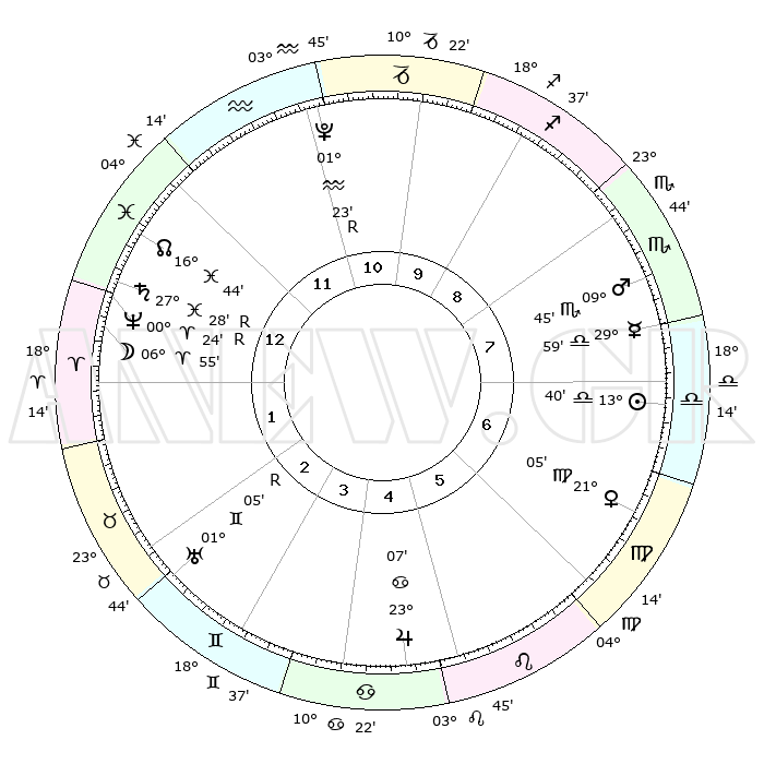 | ΘΕΣΕΙΣ ΠΛΑΝΗΤΩΝ ΑΣΤΡΟΛΟΓΙΚΟΥ ΧΑΡΤΗ ΤΗΣ ΣΤΙΓΜΗΣ ΑΥΤΗΣ | | Πλανήτης | Ζώδιο | Μοίρες | Δεκαήμ. | Σε οίκο | Απόκλιση | | Ακμές των οίκων | Ηλιος | Ζυγός | 13°34' | Δεύτερο | 8 | 05 S 21 | | 1ος | 26°29' | Υδροχόος | Σελήνη | Κριός | 05°35' | Πρώτο | 1 | 03 N 39 | | 2ος | 12°08' | Κριός | Ερμής | Ζυγός | 29°51' | Τρίτο | 8 | 12 S 08 | | 3ος | 15°33' | Ταύρος | Αφροδίτη | Παρθένος | 20°58' | Τρίτο | 7 | 04 N 52 | | 4ος | 10°19' | Δίδυμοι | Αρης | Σκορπιός | 09°41' | Πρώτο | 8 | 14 S 51 | | 5ος | 02°01' | Καρκίνος | Δίας | Καρκίνος | 23°07' | Τρίτο | 5 | 21 N 29 | | 6ος | 25°14' | Καρκίνος | Κρόνος | Ιχθείς | 27°28'R | Τρίτο | 1 | 03 S 18 | | 7ος | 26°29' | Λέων | Ουρανός | Δίδυμοι | 01°05'R | Πρώτο | 3 | 20 N 10 | | 8ος | 12°08' | Ζυγός | Ποσειδώνας | Κριός | 00°24'R | Πρώτο | 1 | 01 S 06 | | 9ος | 15°33' | Σκορπιός | Πλούτωνας | Υδροχόος | 01°23'R | Πρώτο | 12 | 23 S 32 | | 10ος | 10°19' | Τοξότης | Β. Δεσμός | Ιχθείς | 16°45' | Δεύτερο | 1 | 05 S 14 | | 11ος | 02°01' | Αιγόκερως | Ωροσκόπος | Υδροχόος | 26°29' | Τρίτο | | | 12ος | 25°14' | Αιγόκερως | Μεσουράνημα | Τοξότης | 10°19' | Δεύτερο | | | |