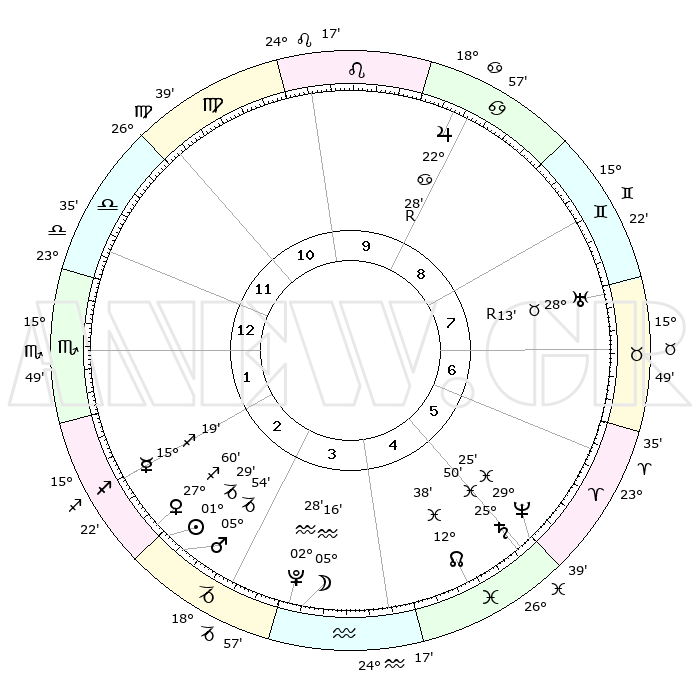 | | ΘΕΣΕΙΣ ΠΛΑΝΗΤΩΝ ΑΣΤΡΟΛΟΓΙΚΟΥ ΧΑΡΤΗ ΤΗΣ ΣΤΙΓΜΗΣ ΑΥΤΗΣ | | | | Πλανήτης | Ζώδιο | Μοίρες | Δεκαήμ. | Σε οίκο | Απόκλιση | | Ακμές των οίκων | | Ηλιος | Αιγόκερως | 01°24' | Πρώτο | 3 | 23 S 26 | | 1ος | 19°58' | Ζυγός | | Σελήνη | Υδροχόος | 04°10' | Πρώτο | 4 | 22 S 10 | | 2ος | 17°49' | Σκορπιός | | Ερμής | Τοξότης | 15°11' | Δεύτερο | 2 | 22 S 06 | | 3ος | 19°06' | Τοξότης | | Αφροδίτη | Τοξότης | 27°53' | Τρίτο | 3 | 23 S 34 | | 4ος | 22°41' | Αιγόκερως | | Αρης | Αιγόκερως | 05°50' | Πρώτο | 3 | 24 S 08 | | 5ος | 25°38' | Υδροχόος | | Δίας | Καρκίνος | 22°29'R | Τρίτο | 9 | 21 N 46 | | 6ος | 25°06' | Ιχθείς | | Κρόνος | Ιχθείς | 25°50' | Τρίτο | 6 | 03 S 46 | | 7ος | 19°58' | Κριός | | Ουρανός | Ταύρος | 28°13'R | Τρίτο | 8 | 19 N 34 | | 8ος | 17°49' | Ταύρος | | Ποσειδώνας | Ιχθείς | 29°25' | Τρίτο | 6 | 01 S 28 | | 9ος | 19°06' | Δίδυμοι | | Πλούτωνας | Υδροχόος | 02°28' | Πρώτο | 4 | 23 S 16 | | 10ος | 22°41' | Καρκίνος | | Β. Δεσμός | Ιχθείς | 12°39' | Δεύτερο | 5 | 06 S 49 | | 11ος | 25°38' | Λέων | | Ωροσκόπος | Ζυγός | 19°58' | Δεύτερο | | | 12ος | 25°06' | Παρθένος | | Μεσουράνημα | Καρκίνος | 22°41' | Τρίτο | | | |