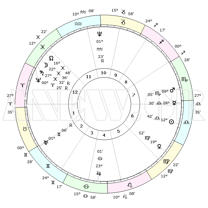 | ΘΕΣΕΙΣ ΠΛΑΝΗΤΩΝ ΑΣΤΡΟΛΟΓΙΚΟΥ ΧΑΡΤΗ ΤΗΣ ΣΤΙΓΜΗΣ ΑΥΤΗΣ | | Πλανήτης | Ζώδιο | Μοίρες | Δεκαήμ. | Σε οίκο | Απόκλιση | | Ακμές των οίκων | Ηλιος | Ζυγός | 12°36' | Δεύτερο | 7 | 04 S 59 | | 1ος | 04°23' | Ιχθείς | Σελήνη | Ιχθείς | 21°16' | Τρίτο | 1 | 03 S 12 | | 2ος | 19°24' | Κριός | Ερμής | Ζυγός | 28°21' | Τρίτο | 8 | 11 S 30 | | 3ος | 21°15' | Ταύρος | Αφροδίτη | Παρθένος | 19°45' | Δεύτερο | 7 | 05 N 20 | | 4ος | 15°14' | Δίδυμοι | Αρης | Σκορπιός | 09°01' | Πρώτο | 8 | 14 S 37 | | 5ος | 06°55' | Καρκίνος | Δίας | Καρκίνος | 23°00' | Τρίτο | 5 | 21 N 30 | | 6ος | 00°57' | Λέων | Κρόνος | Ιχθείς | 27°33'R | Τρίτο | 1 | 03 S 17 | | 7ος | 04°23' | Παρθένος | Ουρανός | Δίδυμοι | 01°06'R | Πρώτο | 3 | 20 N 10 | | 8ος | 19°24' | Ζυγός | Ποσειδώνας | Κριός | 00°25'R | Πρώτο | 1 | 01 S 06 | | 9ος | 21°15' | Σκορπιός | Πλούτωνας | Υδροχόος | 01°23'R | Πρώτο | 12 | 23 S 32 | | 10ος | 15°14' | Τοξότης | Β. Δεσμός | Ιχθείς | 16°48' | Δεύτερο | 1 | 05 S 13 | | 11ος | 06°55' | Αιγόκερως | Ωροσκόπος | Ιχθείς | 04°23' | Πρώτο | | | 12ος | 00°57' | Υδροχόος | Μεσουράνημα | Τοξότης | 15°14' | Δεύτερο | | | |