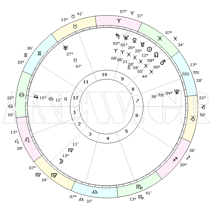 | | ΘΕΣΕΙΣ ΠΛΑΝΗΤΩΝ ΑΣΤΡΟΛΟΓΙΚΟΥ ΧΑΡΤΗ ΤΗΣ ΣΤΙΓΜΗΣ ΑΥΤΗΣ | | | | Πλανήτης | Ζώδιο | Μοίρες | Δεκαήμ. | Σε οίκο | Απόκλιση | | Ακμές των οίκων | | Ηλιος | Ιχθείς | 12°52' | Δεύτερο | 9 | 06 S 44 | | 1ος | 04°00' | Καρκίνος | | Σελήνη | Παρθένος | 12°22' | Δεύτερο | 3 | 06 N 38 | | 2ος | 24°36' | Καρκίνος | | Ερμής | Ιχθείς | 20°31'R | Τρίτο | 10 | 00 S 27 | | 3ος | 16°41' | Λέων | | Αφροδίτη | Ιχθείς | 26°16' | Τρίτο | 10 | 02 S 42 | | 4ος | 13°39' | Παρθένος | | Αρης | Ιχθείς | 00°41' | Πρώτο | 9 | 12 S 15 | | 5ος | 18°11' | Ζυγός | | Δίας | Καρκίνος | 15°11'R | Δεύτερο | 1 | 22 N 55 | | 6ος | 27°51' | Σκορπιός | | Κρόνος | Κριός | 02°08' | Πρώτο | 10 | 01 S 06 | | 7ος | 04°00' | Αιγόκερως | | Ουρανός | Ταύρος | 27°47' | Τρίτο | 11 | 19 N 29 | | 8ος | 24°36' | Αιγόκερως | | Ποσειδώνας | Κριός | 01°08' | Πρώτο | 10 | 00 S 45 | | 9ος | 16°41' | Υδροχόος | | Πλούτωνας | Υδροχόος | 04°36' | Πρώτο | 8 | 22 S 52 | | 10ος | 13°39' | Ιχθείς | | Β. Δεσμός | Ιχθείς | 08°55' | Πρώτο | 9 | 08 S 14 | | 11ος | 18°11' | Κριός | | Ωροσκόπος | Καρκίνος | 04°00' | Πρώτο | | | 12ος | 27°51' | Ταύρος | | Μεσουράνημα | Ιχθείς | 13°39' | Δεύτερο | | | |
