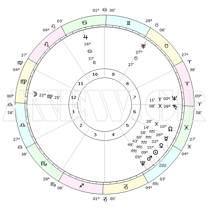 | | ΘΕΣΕΙΣ ΠΛΑΝΗΤΩΝ ΑΣΤΡΟΛΟΓΙΚΟΥ ΧΑΡΤΗ ΤΗΣ ΣΤΙΓΜΗΣ ΑΥΤΗΣ | | | | Πλανήτης | Ζώδιο | Μοίρες | Δεκαήμ. | Σε οίκο | Απόκλιση | | Ακμές των οίκων | | Ηλιος | Υδροχόος | 15°55' | Δεύτερο | 6 | 16 S 04 | | 1ος | 08°17' | Παρθένος | | Σελήνη | Παρθένος | 21°25' | Τρίτο | 1 | 02 N 22 | | 2ος | 02°60' | Ζυγός | | Ερμής | Υδροχόος | 26°06' | Τρίτο | 6 | 14 S 18 | | 3ος | 02°20' | Σκορπιός | | Αφροδίτη | Υδροχόος | 22°52' | Τρίτο | 6 | 15 S 13 | | 4ος | 05°17' | Τοξότης | | Αρης | Υδροχόος | 09°40' | Πρώτο | 5 | 18 S 51 | | 5ος | 08°58' | Αιγόκερως | | Δίας | Καρκίνος | 16°57'R | Δεύτερο | 11 | 22 N 40 | | 6ος | 10°21' | Υδροχόος | | Κρόνος | Ιχθείς | 29°08' | Τρίτο | 7 | 02 S 20 | | 7ος | 08°17' | Ιχθείς | | Ουρανός | Ταύρος | 27°27' | Τρίτο | 9 | 19 N 24 | | 8ος | 02°60' | Κριός | | Ποσειδώνας | Κριός | 00°15' | Πρώτο | 7 | 01 S 06 | | 9ος | 02°20' | Ταύρος | | Πλούτωνας | Υδροχόος | 03°49' | Πρώτο | 5 | 23 S 00 | | 10ος | 05°17' | Δίδυμοι | | Β. Δεσμός | Ιχθείς | 10°20' | Δεύτερο | 7 | 07 S 42 | | 11ος | 08°58' | Καρκίνος | | Ωροσκόπος | Παρθένος | 08°17' | Πρώτο | | | 12ος | 10°21' | Λέων | | Μεσουράνημα | Δίδυμοι | 05°17' | Πρώτο | | | |